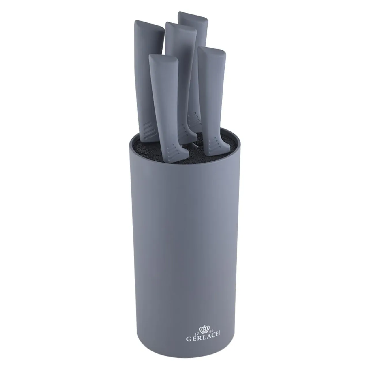 Całość jest umieszczona w nowoczesnym bloku z wysokiej jakości tworzywa. Blok jest wypełniony specjalnymi pręcikami z tworzywa, dzięki czemu ostrza noży są w odpowiedni sposób zabezpieczone, łatwo je wyciągniesz i odłożysz na miejsce.