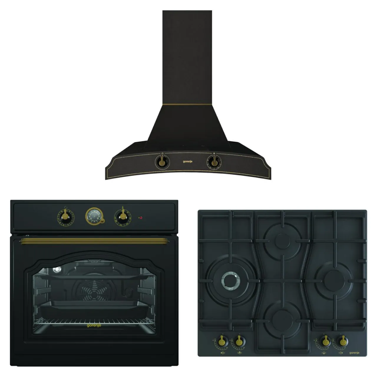 Gorenje Zestaw retro czarny CLASSICO – piekarnik, płyta gazowa, okap