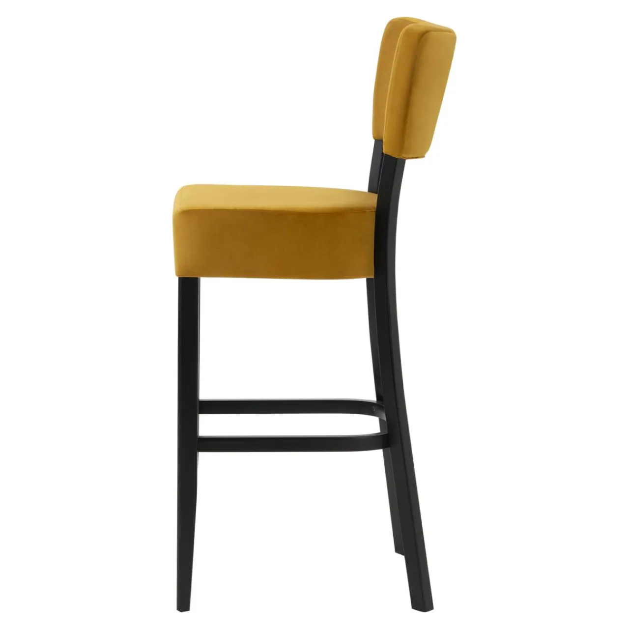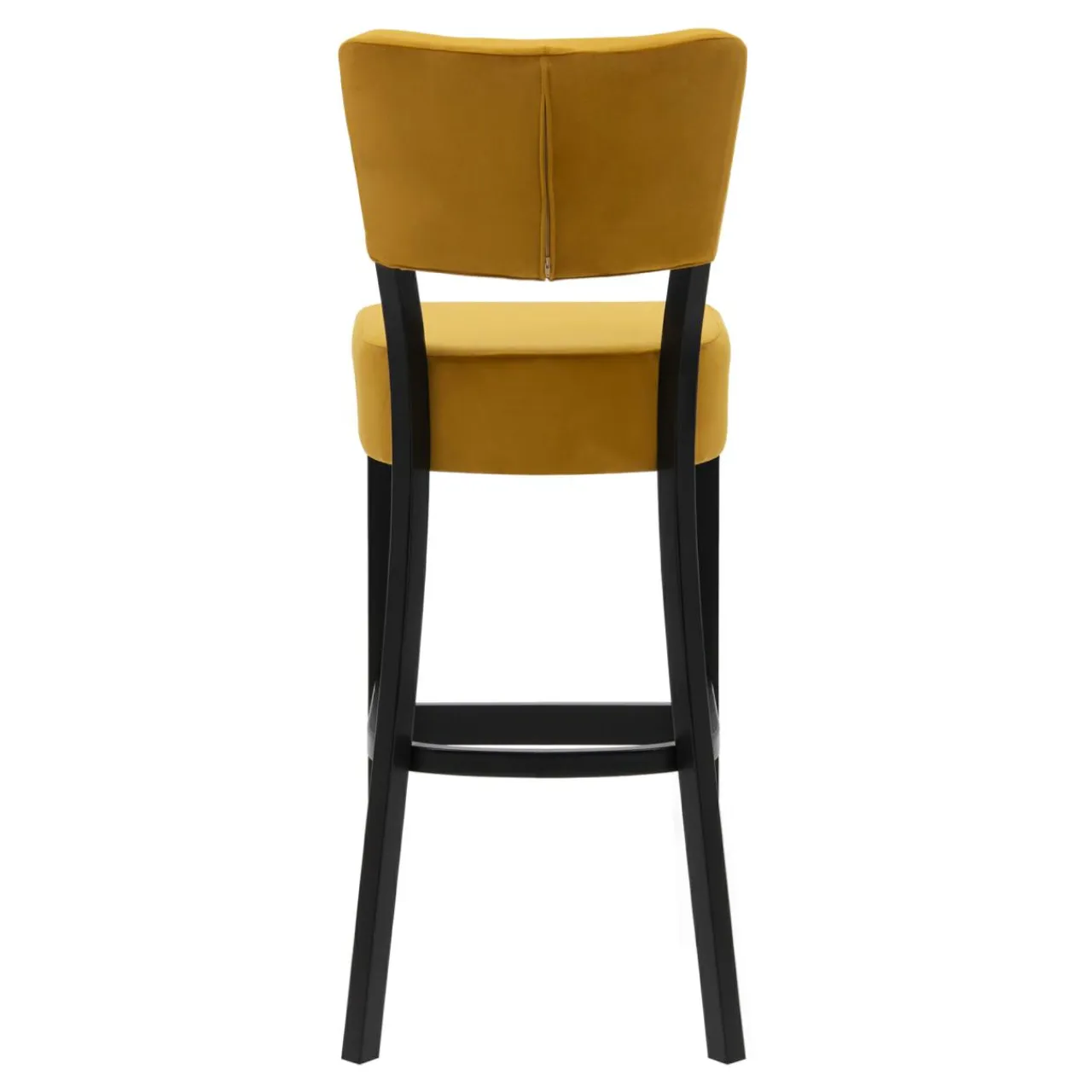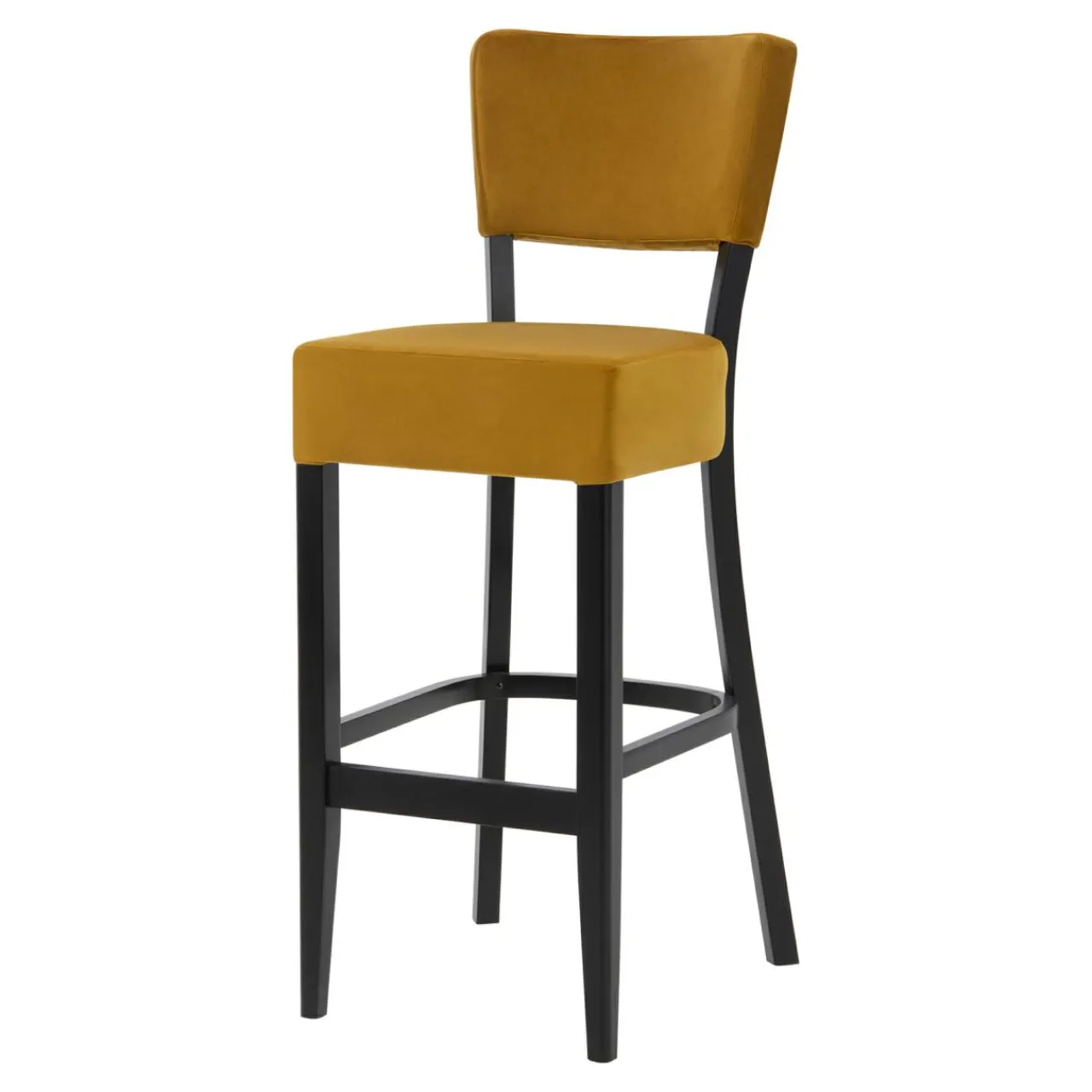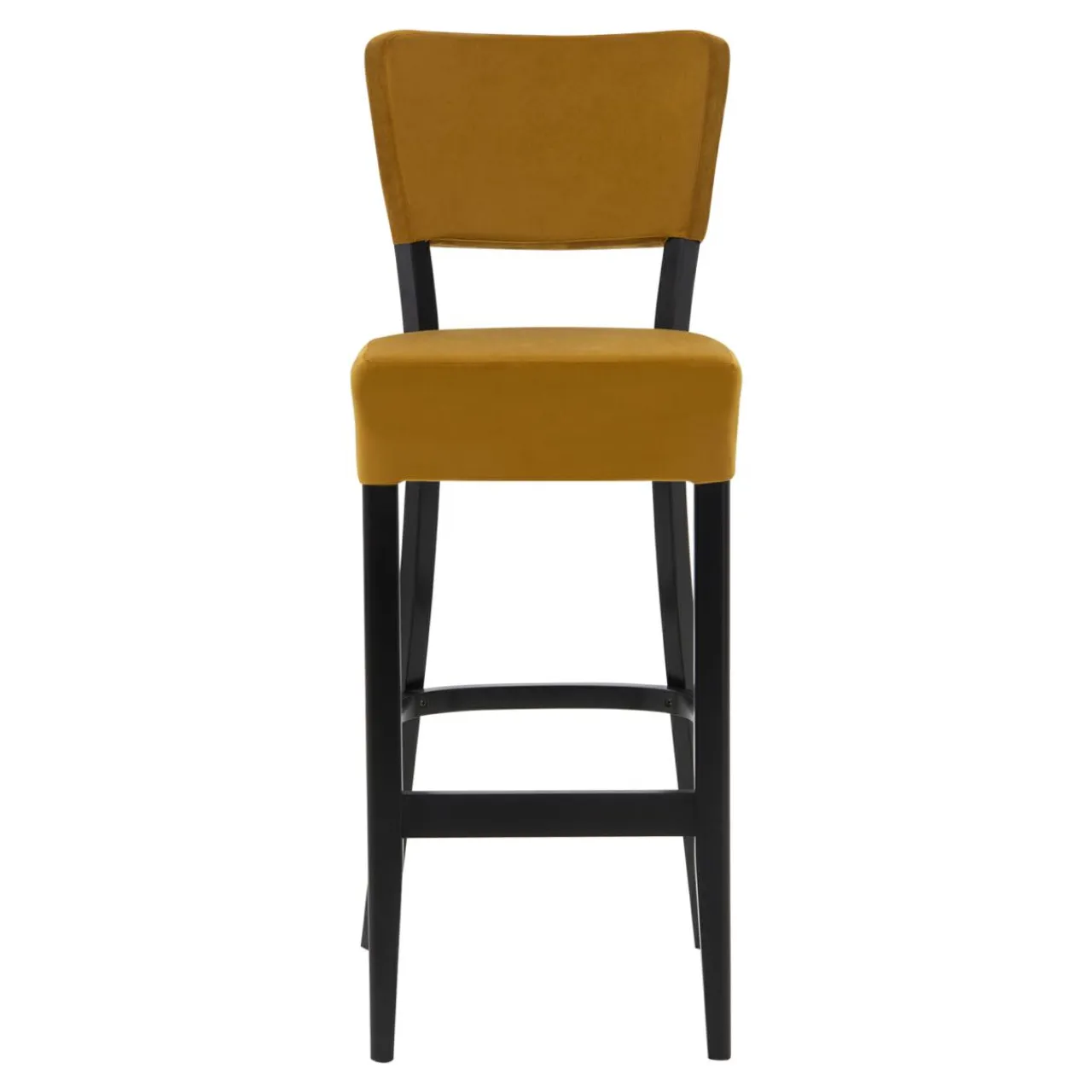 Krzesło barowe RYAN ma czarną podstawę, a siedzisko i oparcie pokryte tkaniną w kolorze musztardowym. To estetyczne połączenie kolorystyczne sprawi, że będzie przytulnie.