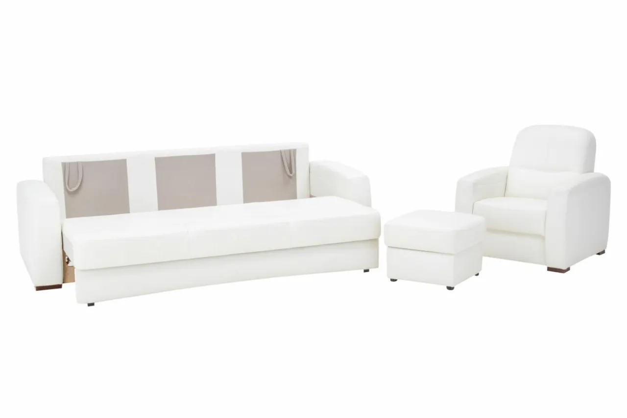 Komplet YUKA to zestaw uniwersalny, będziesz go mógł wykorzystać zarówno w nowoczesnych, jak i bardziej klasycznych wnętrzach. Sofa posiada funkcje spania oraz pojemnik na pościel. Luźne poduchy pozwolą na przyjęcie wygodnej pozycji podczas siedzenia a wbudowane sprężyny bonell podnoszą komfort użytkowania mebla.