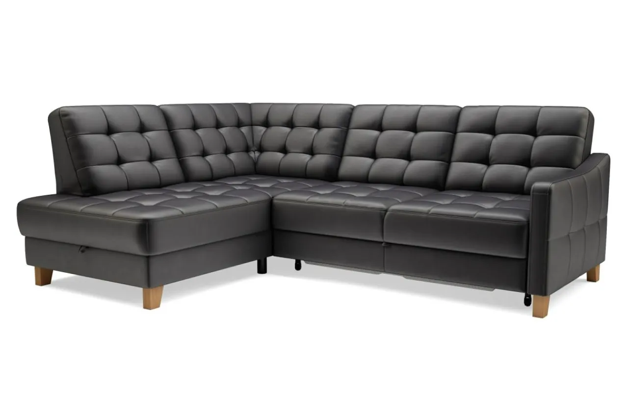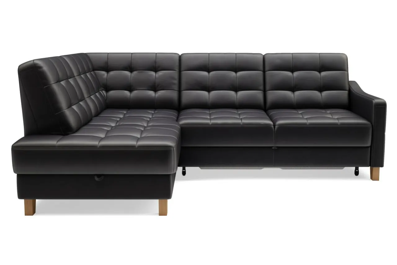 Mebel wypoczynkowy pokryty czarnymi skórami (naturalną i ekologiczną) może prezentować się lekko. Dowodem jest narożnik MALMO, którego urok tkwi w zgrabej bryle i pikowanej powierzchni skóry.