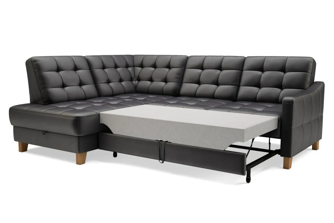 Narożnik można rozłożyć bez konieczności odsuwania go od ściany, dzięki łatwemu w obsłudze mechanizmowi – delfin.