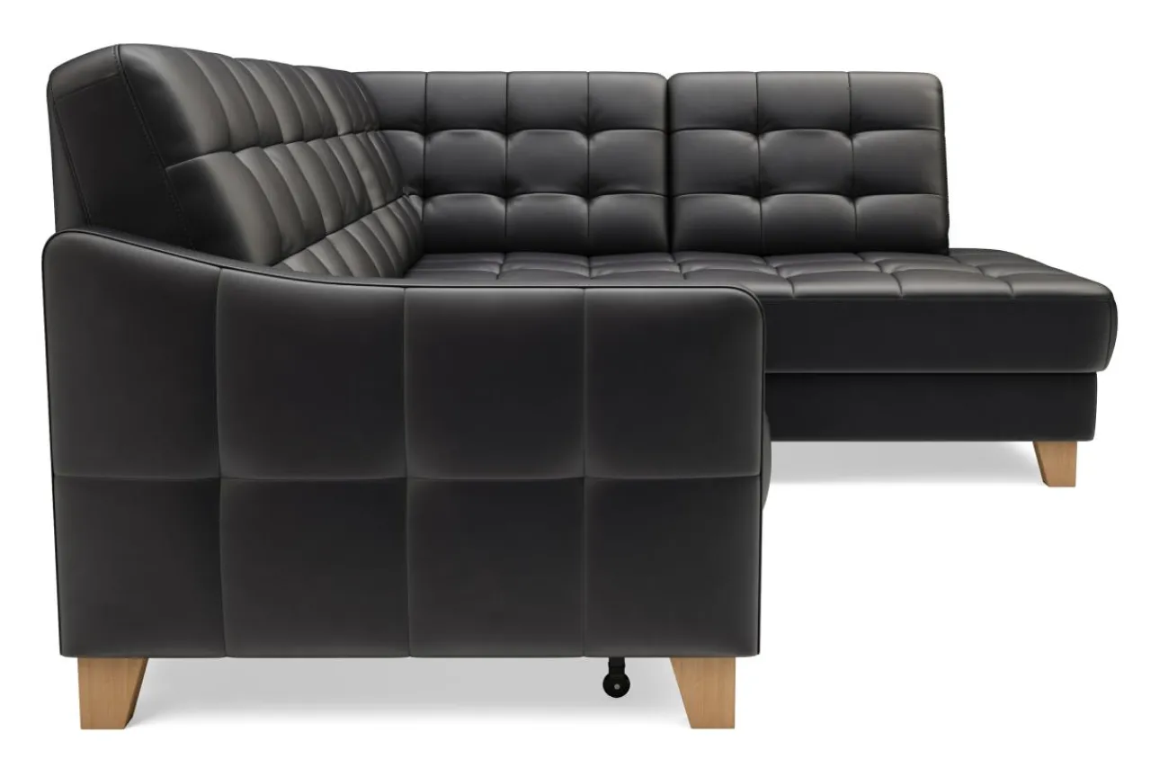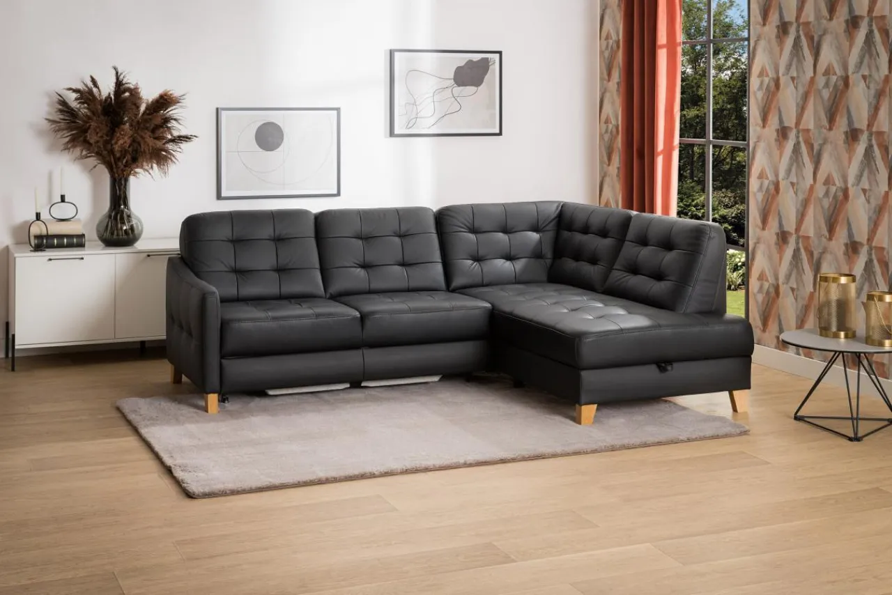 Mebel wypoczynkowy pokryty czarnymi skórami (naturalną i ekologiczną) może prezentować się lekko. Dowodem jest narożnik MALMO, którego urok tkwi w zgrabej bryle i pikowanej powierzchni skóry.