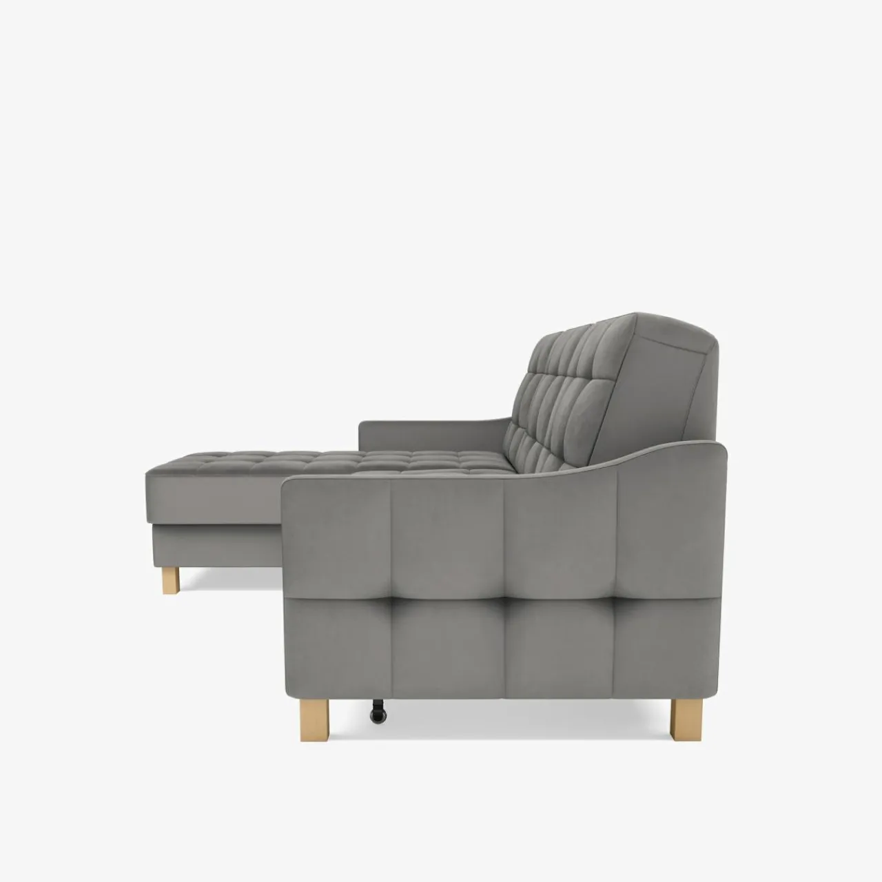 W narożniku MALMO zastosowano materiał PIANO – przyjemną w dotyku, welurową tkaninę, przypominająca aksamit. Na szczególną uwagę zasługują wykonane z drewna nóżki mebla.