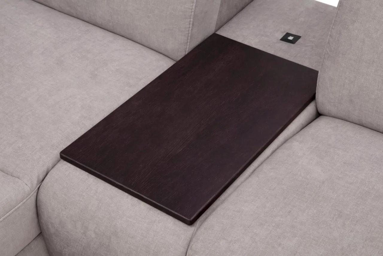 Barek z prostym, drewnianym blatem w kolorystyce wenge znajduje się w środkowej sekcji narożnika. Po podniesieniu blatu do góry zyskujesz dostęp do przestronnego pojemnika, w którym możesz ukryć słodycze lub chipsy.