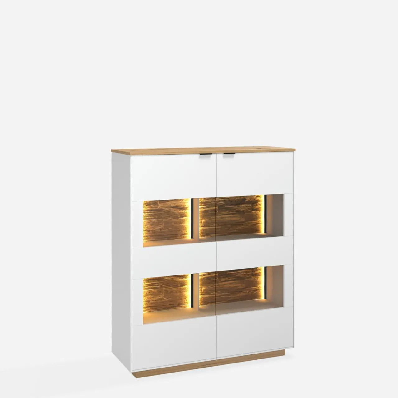 - Zanurz się w grze świateł i faktur — wbudowane oświetlenie LED w ciepłej tonacji wydobywa rysunek dębu, podkreślając ich unikalną strukturę.