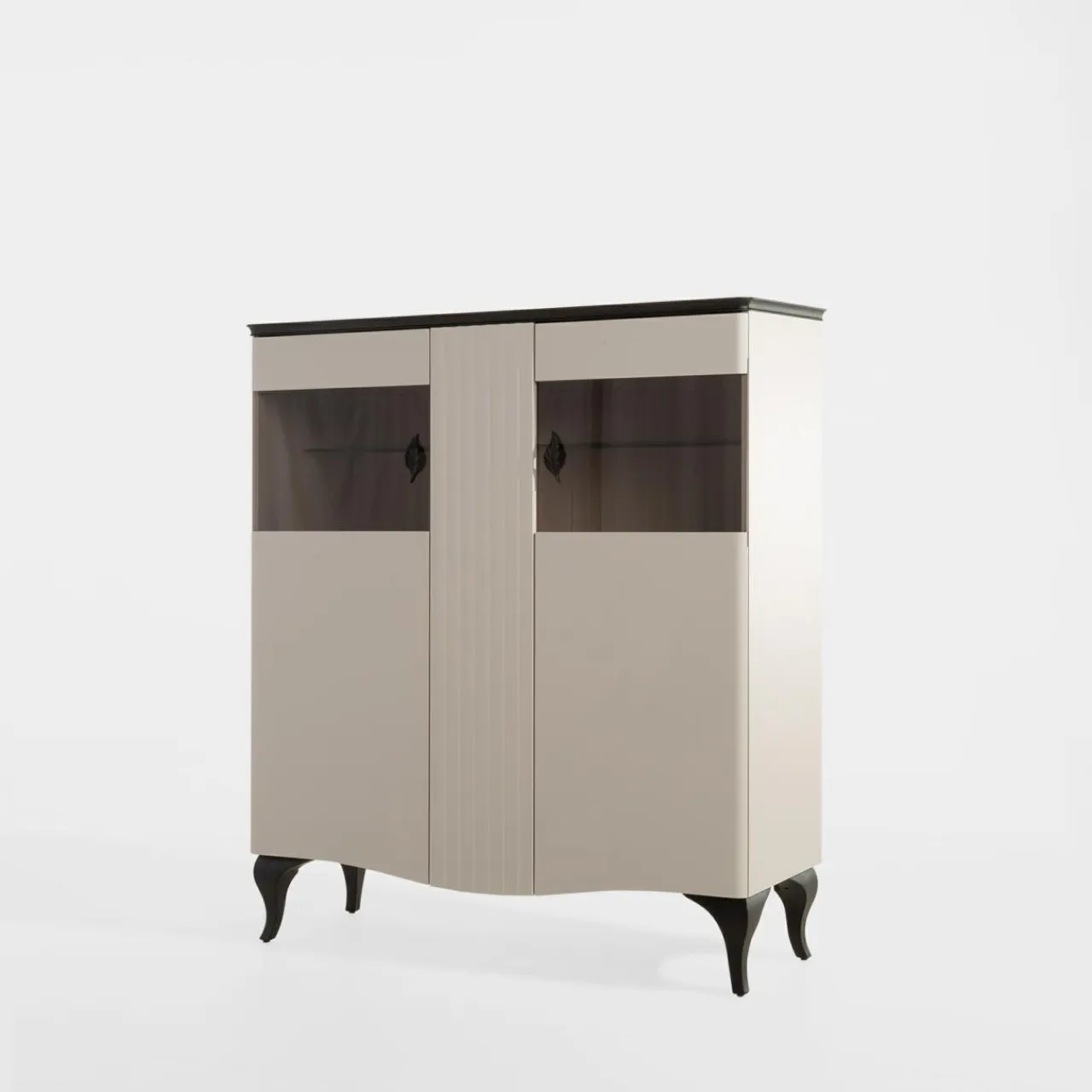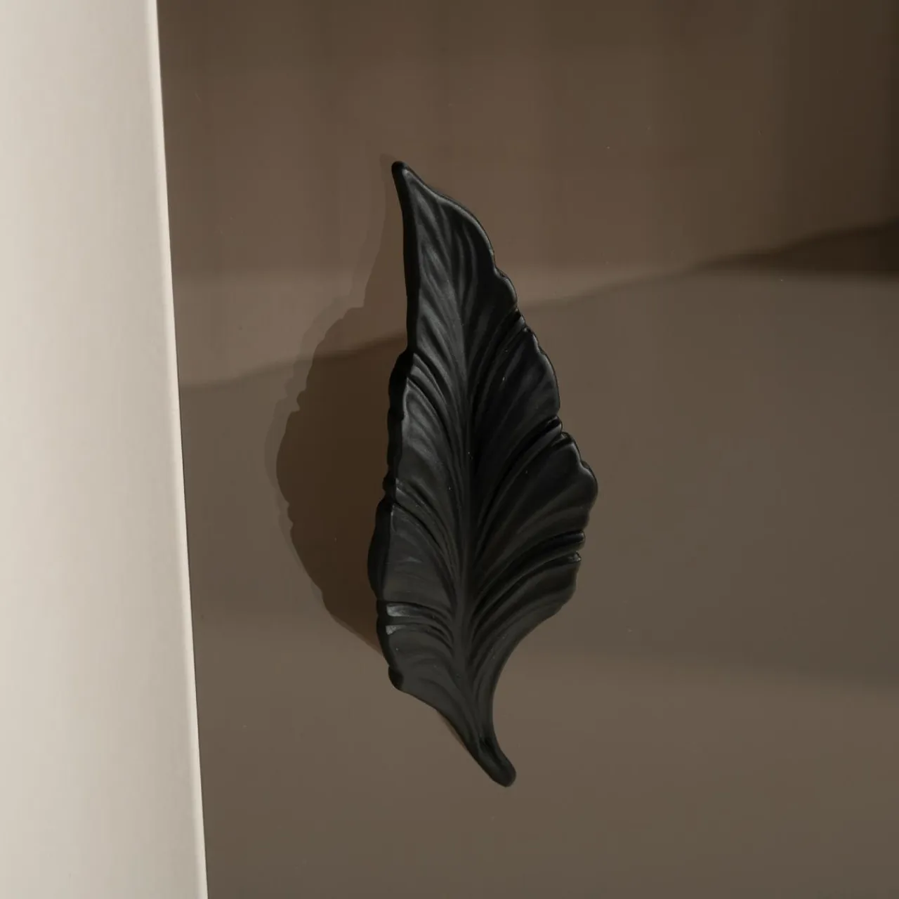 - Nietuzinkowe uchwyty z liściem pełnią rolę funkcjonalną, ale także stanowią ozdobę pomieszczenia. Ciemne, metalowe listki wyróżniają na tle frontów w odcieniach savany i kaszmiru.