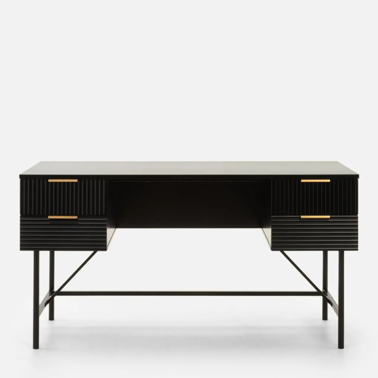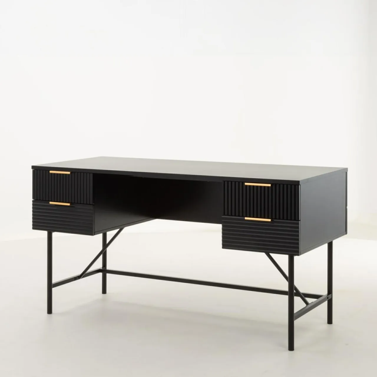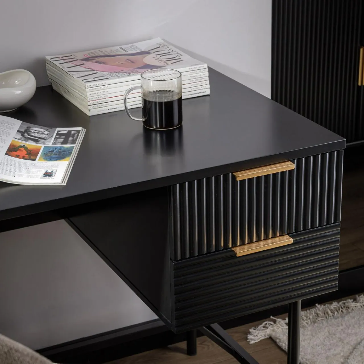 - Złote uchwyty dopełniają czarne geometryczne bryły mebli.
