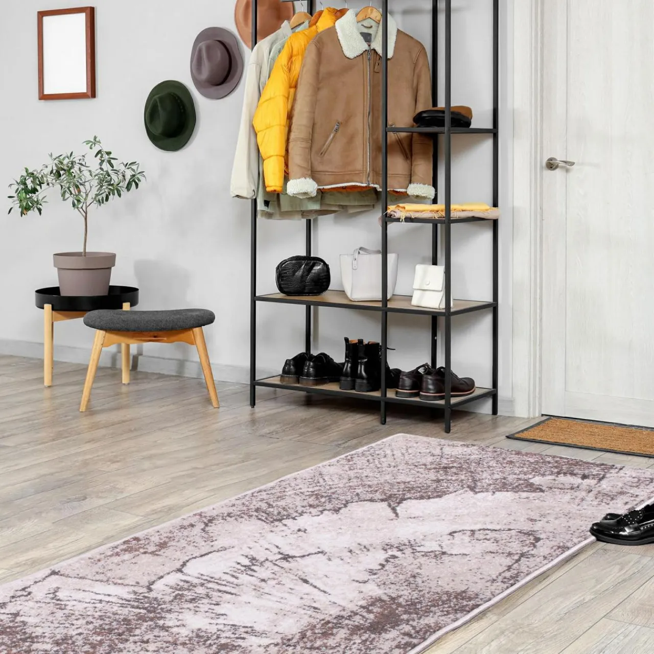 - Sprawdzi się w przedpokoju. Będzie pasował do nowoczesnego wnętrza w loftowym stylu. Obecne we wzorze dywanu kolorystyczne wątki beżów i brązów korespondować będą z czerwienią cegły, dekoracjami w odcieniu złota i miedzi.