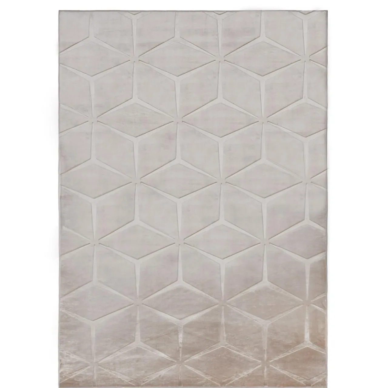 - Runo dywanu jest dwupoziomowe, dzięki temu powstaje ciekawy efekt 3 D. Geometryczny wzór jest wytłoczony w welurze. Światło będzie załamywało się na jego powierzchni w intrygujący sposób.