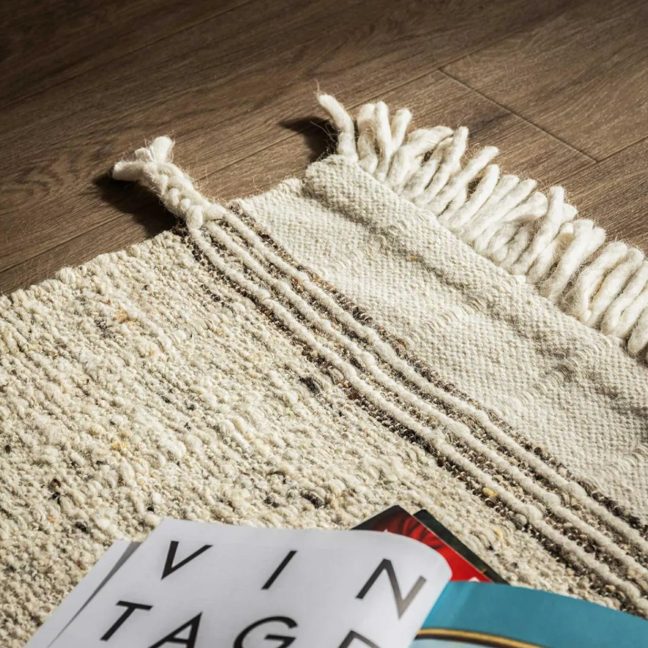 - Wykończenie brzegów frędzlami dodaje dywanowi mniej formalną formę, przez co tworzy bardziej przytulną przestrzeń.
