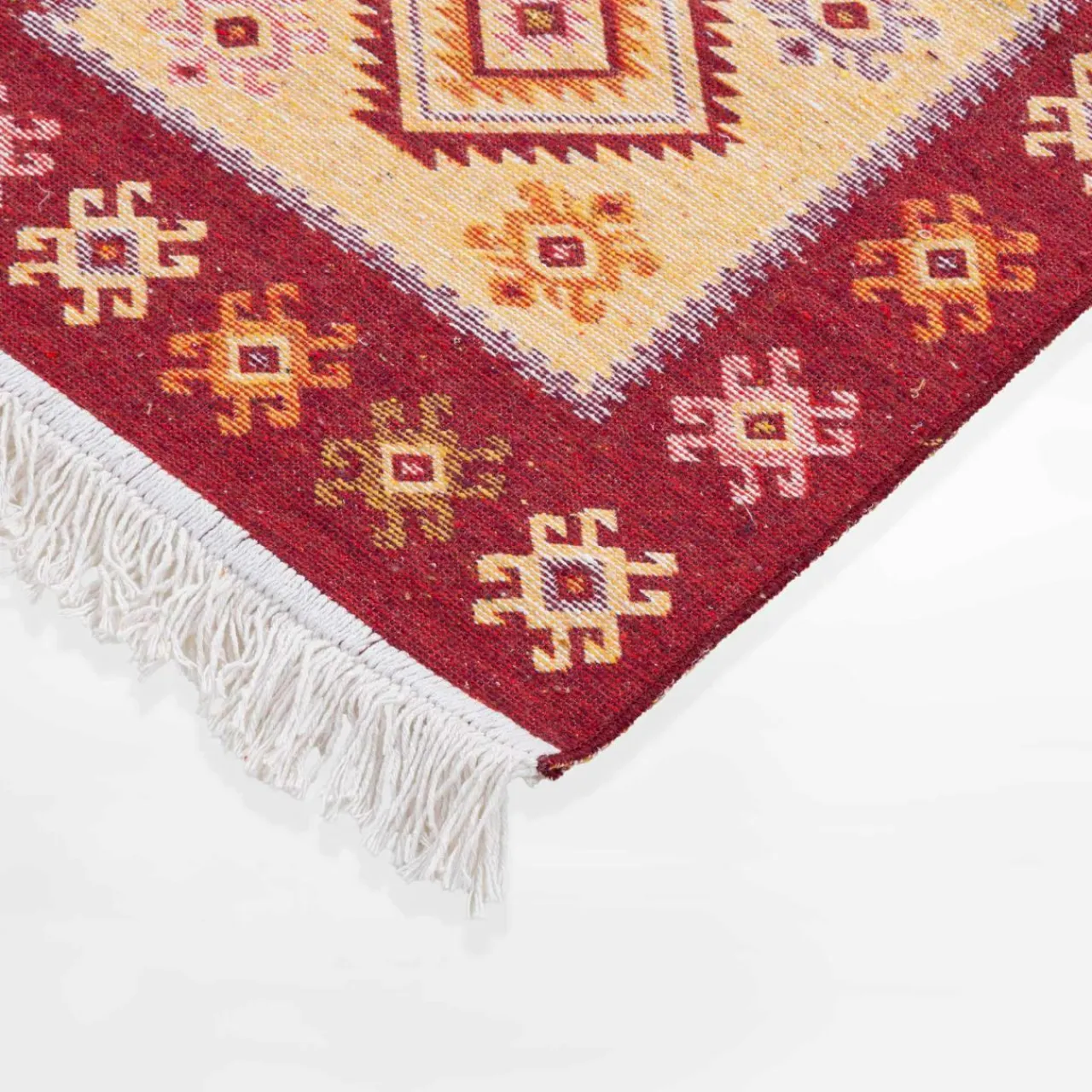 - Bordowy kolor wiedzie tu prym. W połączeniu z odcieniami beżu i brązu dywanik tworzy spójną całość.