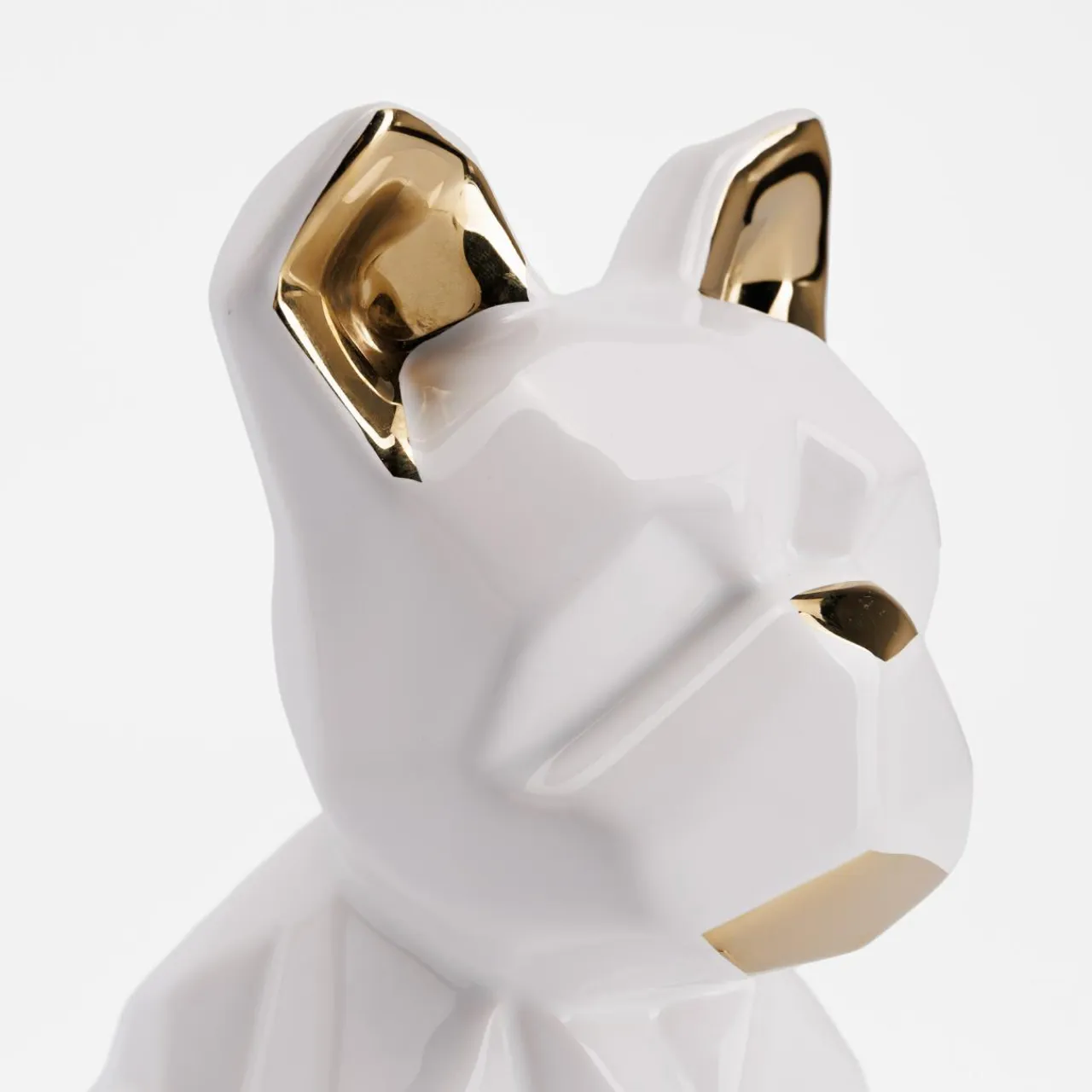 - Wykończona w białym kolorze, wzbogacona jest o subtelne złote akcenty na uszach, nosie i łapach, co dodaje jej luksusowego charakteru.