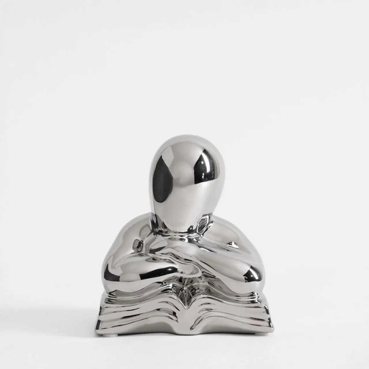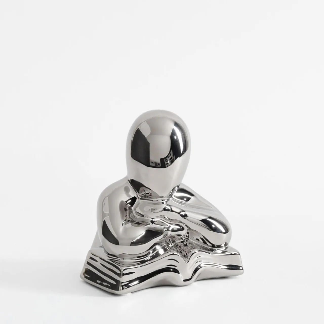 - Zamyślona postać opiera swoje ramiona o otwartą książkę, podkreślając jej marzycielski ton.
