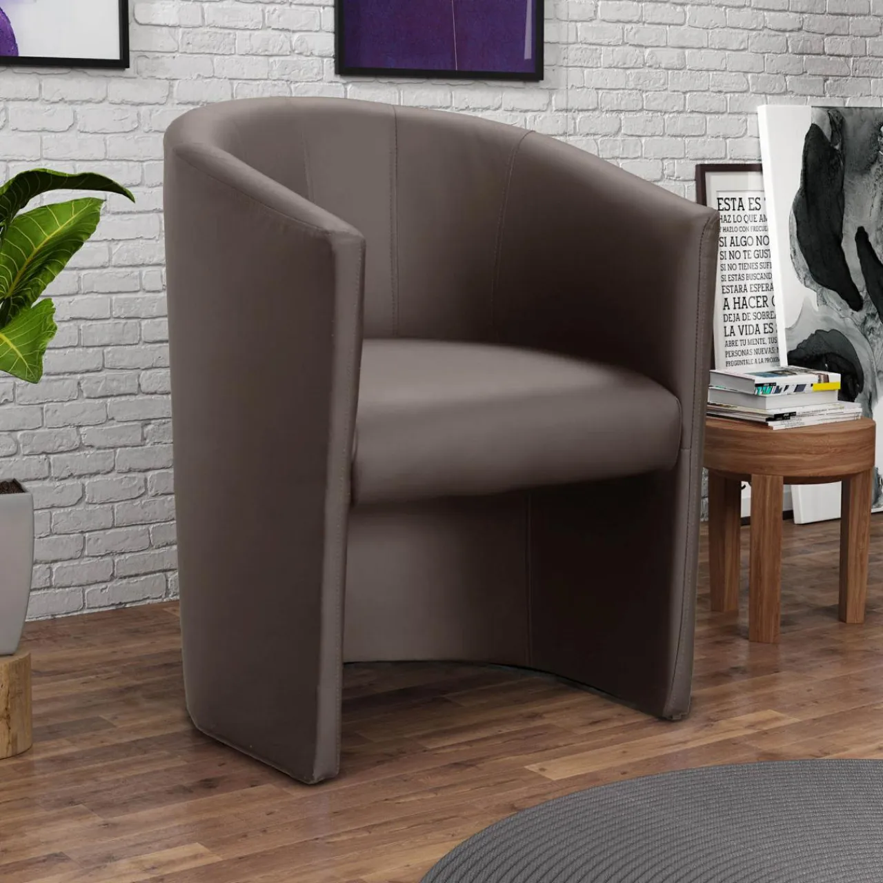 Tapicerka w kolorze szarobrązowym i zgrabny kształt sprawiają, że fotel doskonale wpasuje się we wnętrza o klasycznym lub loftowym charakterze.