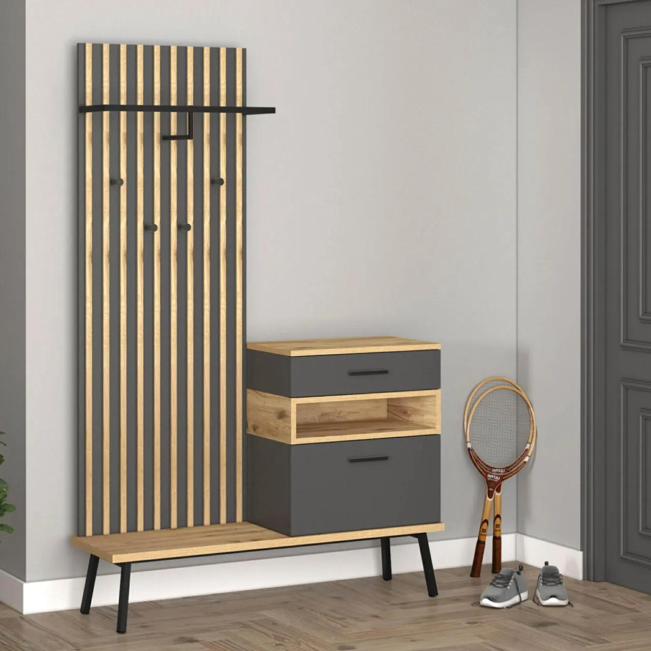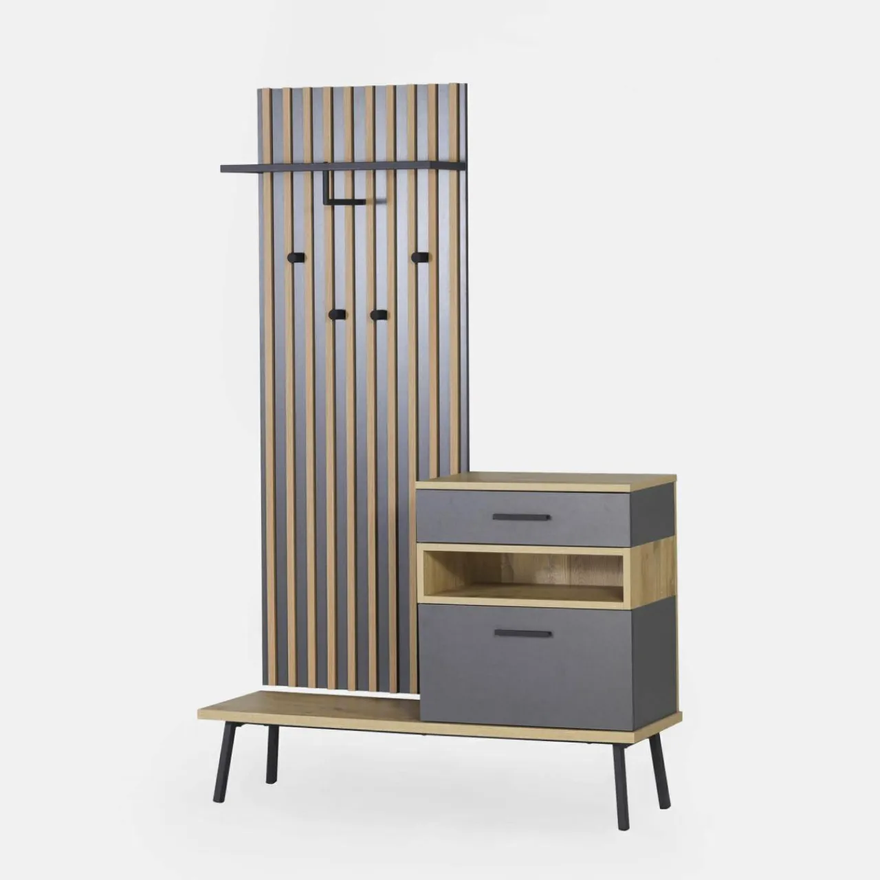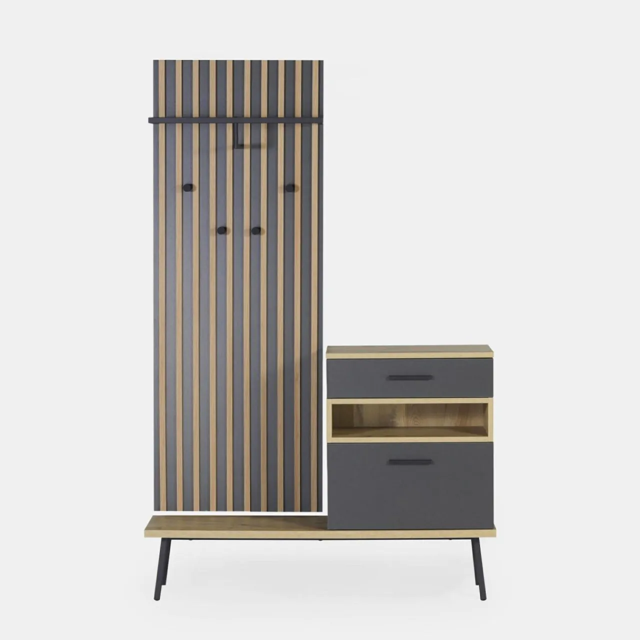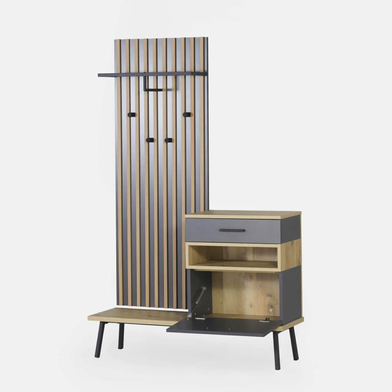 Garderoba ROZA sprawdzi się na niewielkim przedpokoju mieszkania lub przedsionku w domu. Obuwie wsuniesz pod mebel dzięki wysokim nóżkom lub schowasz je do szafki klapowej, a sezonowe kurtki odwiesisz na 4 haczykach.