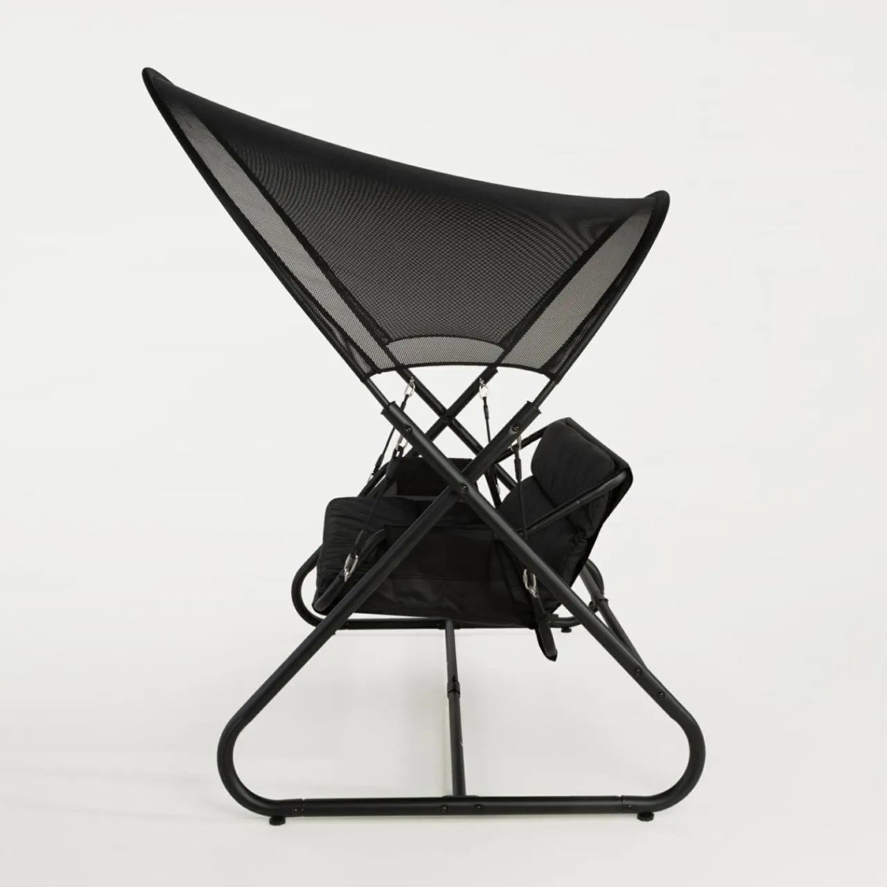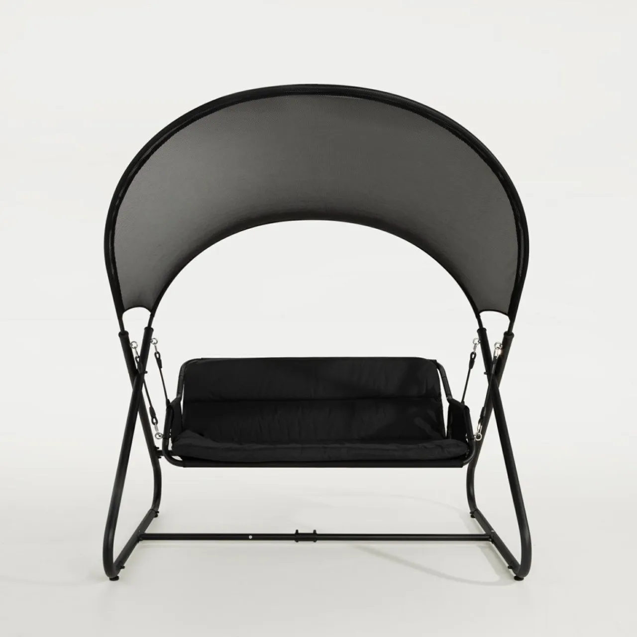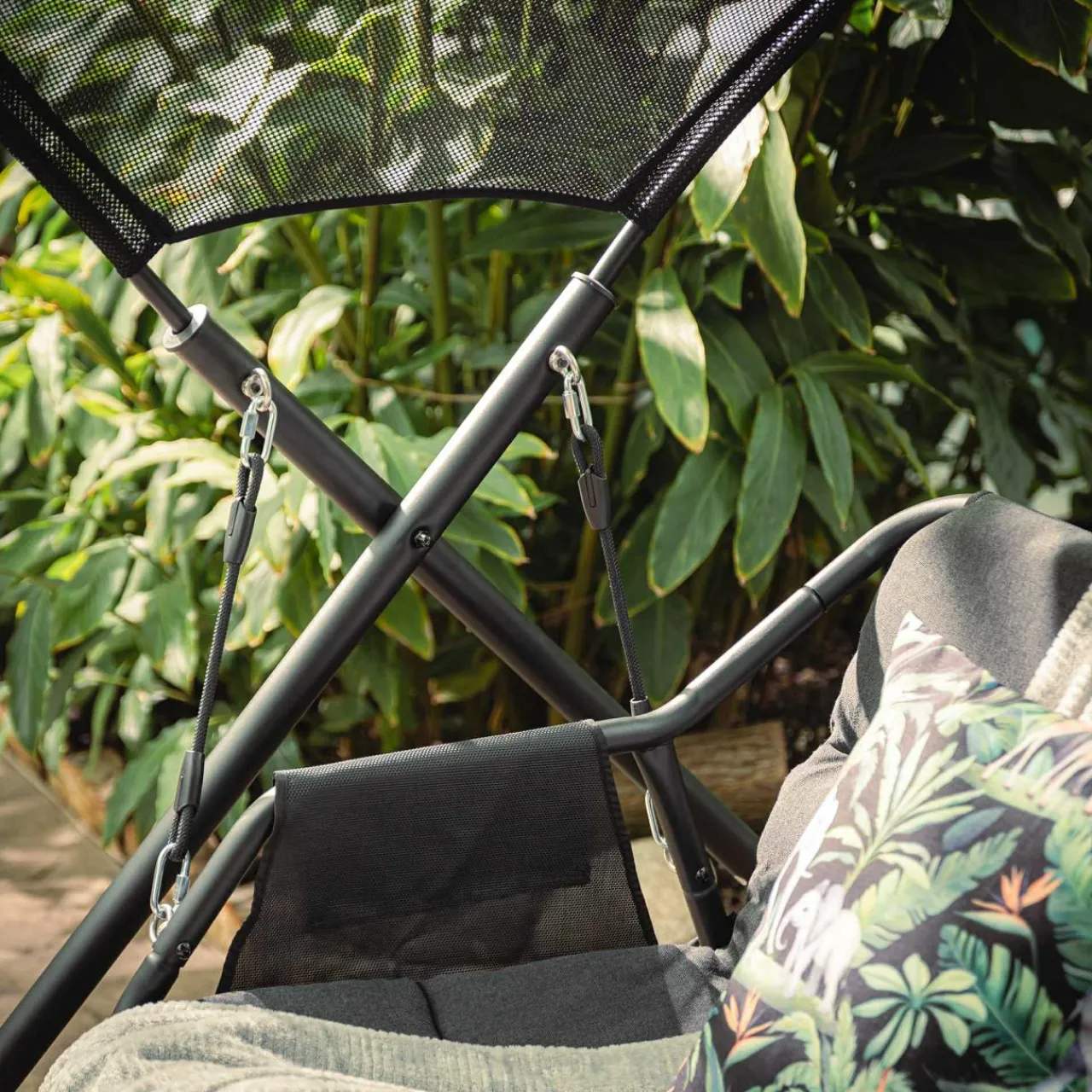 - Duży dach z siatki mesh tworzy delikatną ochronę przed słońcem.