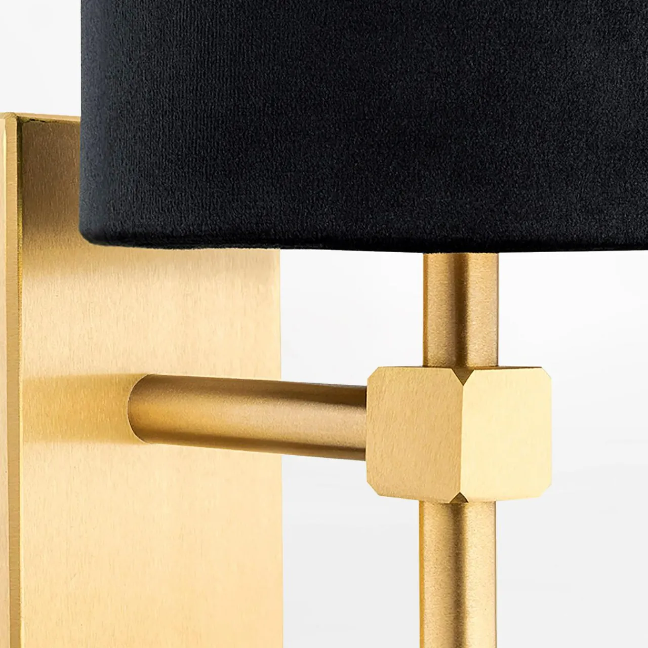 - Abażur z tkaniny ma gładką welurową powierzchnię, która została zestawiona ze złotym, szczotkowanym wykończeniem podstawy – przyciąga uwagę i rozjaśnia optycznie wnętrze.