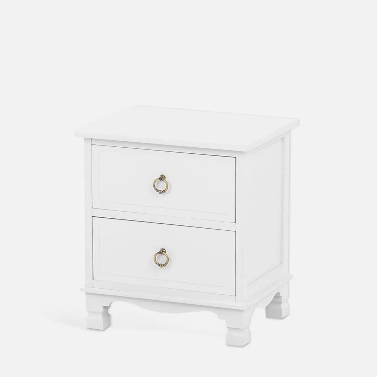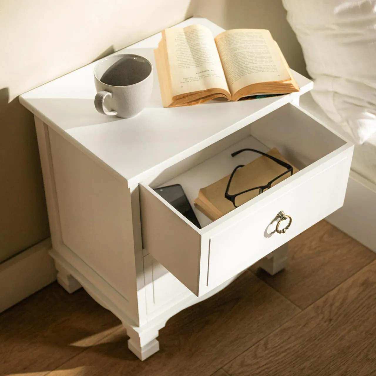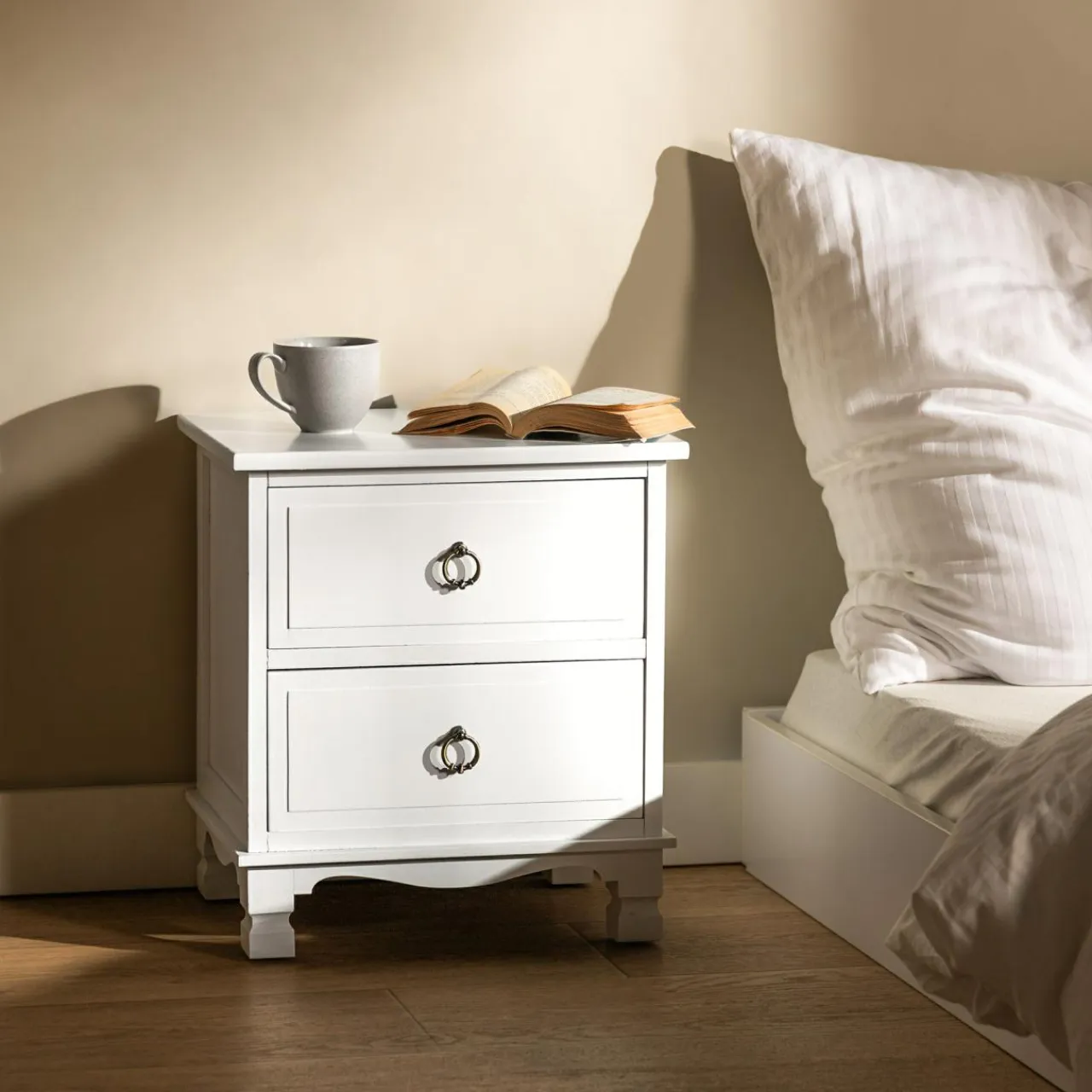 Jest idealna do eleganckiej sypialni z białymi motywami. Szafka nocna CLESS zachwyca ozdobnymi uchwytami i podstawą inspirowaną stylem klasycznym.