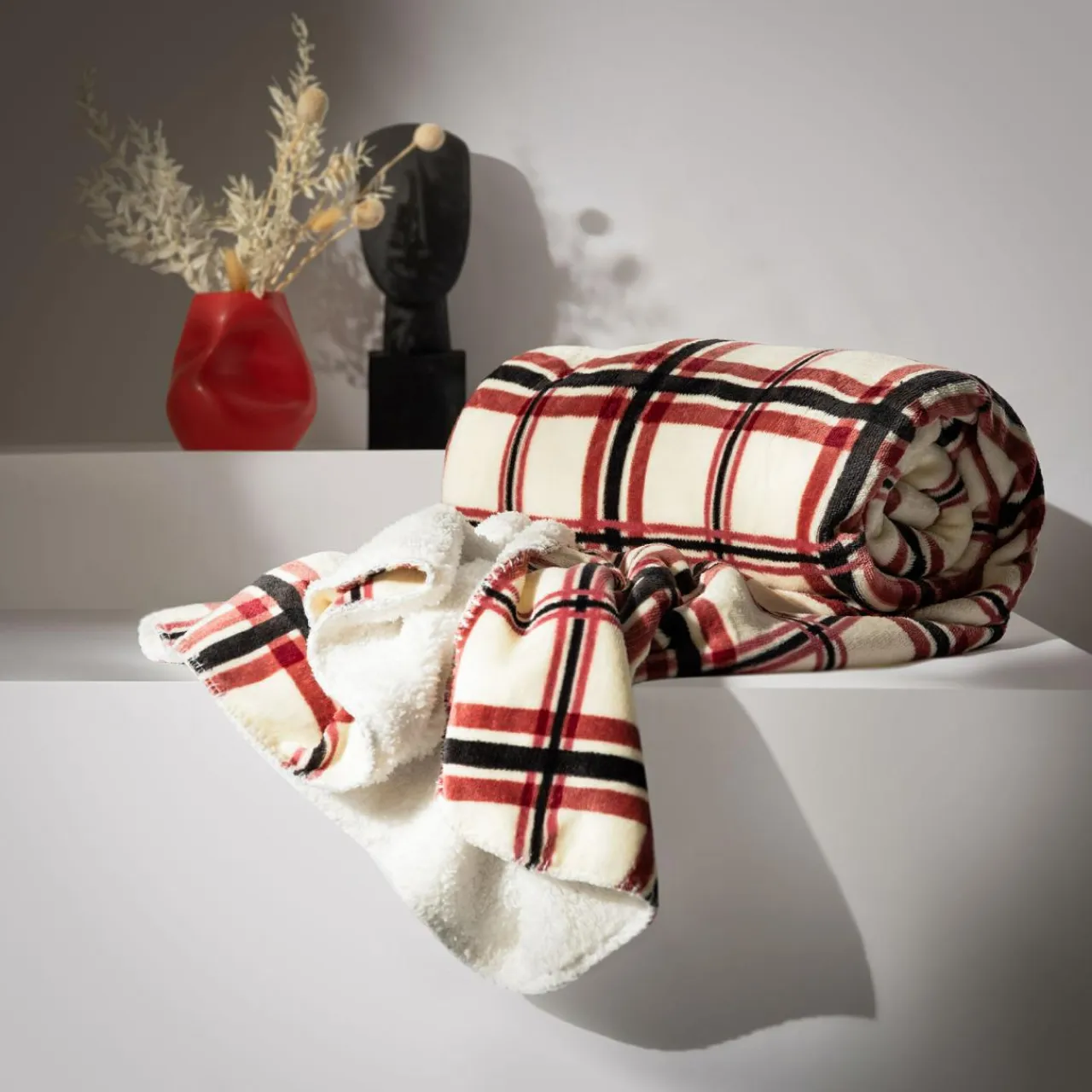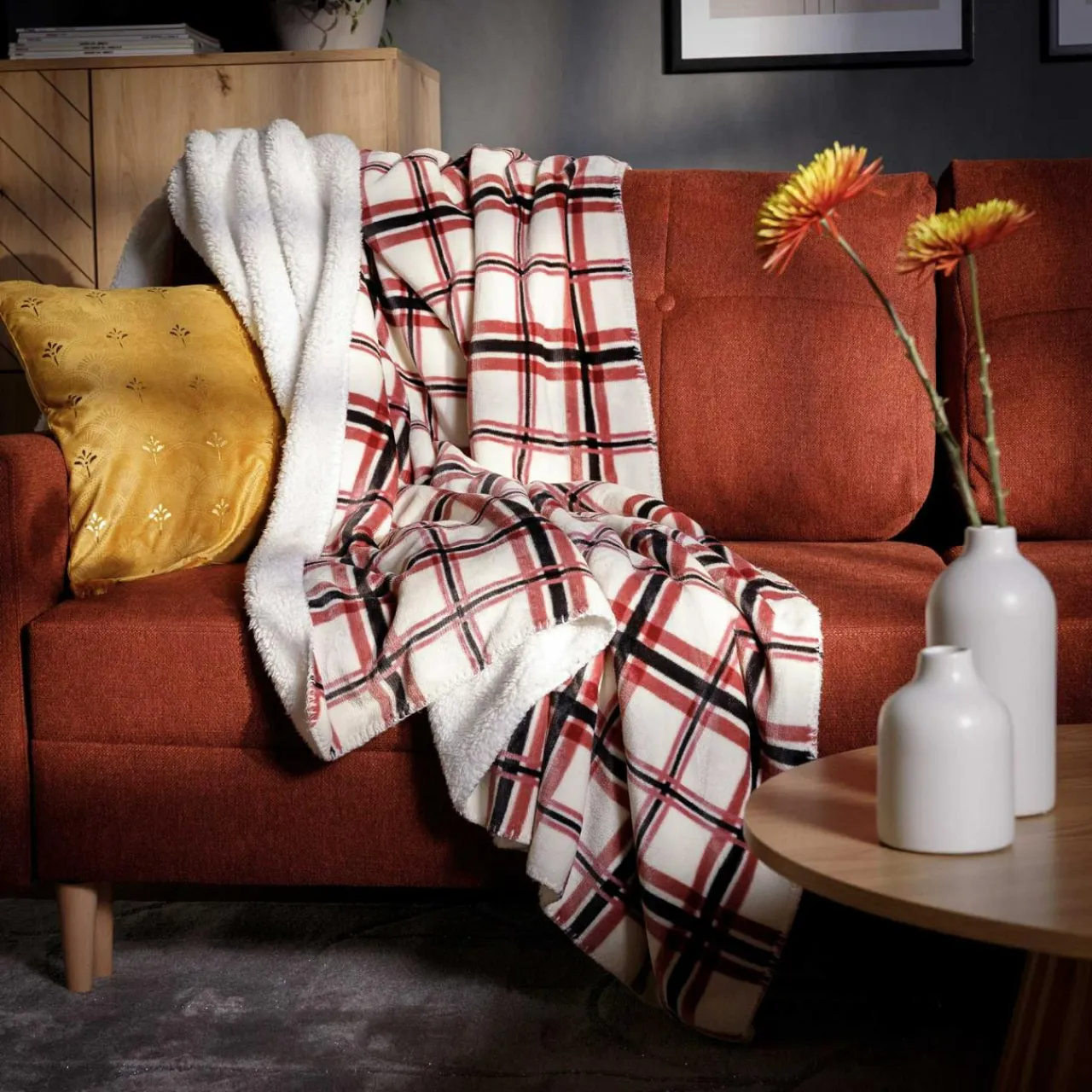 Koc DOLLY jest uszyty z miękkiego i wytrzymałego poliestru. Klasyczny wzór w kratkę dopasujesz się w różnych aranżacyjne pomysły.