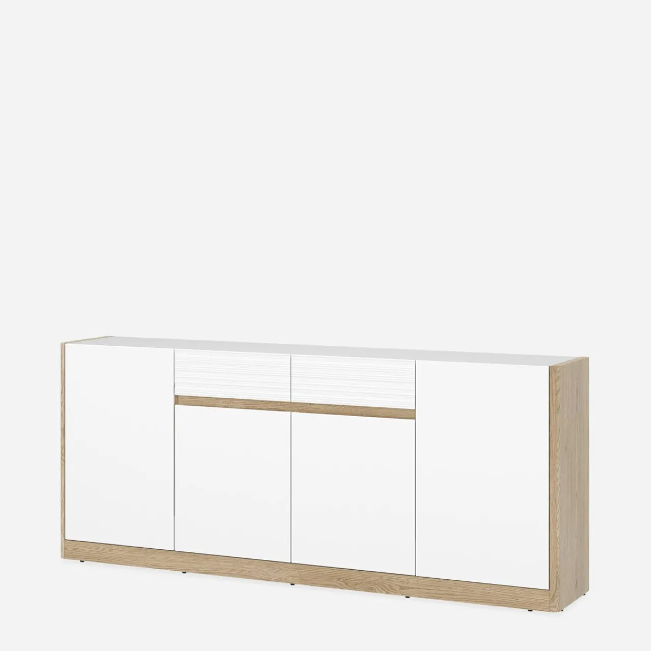 Komoda 4-drzwiowa CALIMA to rozwiązanie dla większych przestrzeni. Jej szerokość wynosząca 185,6 cm sprawia, że jest idealna do przestronnych salonów, sypialni czy jadalni, zwłaszcza tych w jasnych, nowoczesnych tonacjach.
