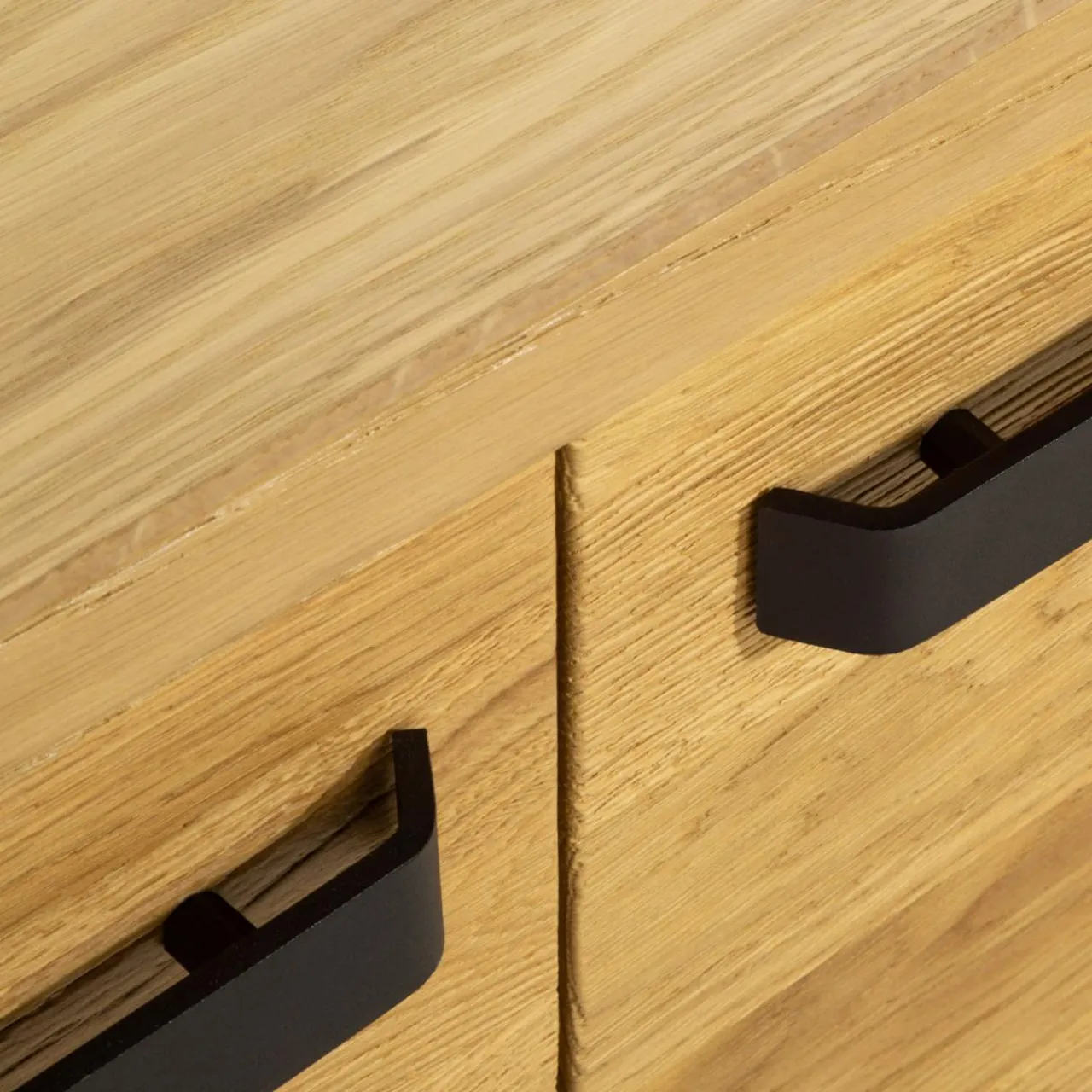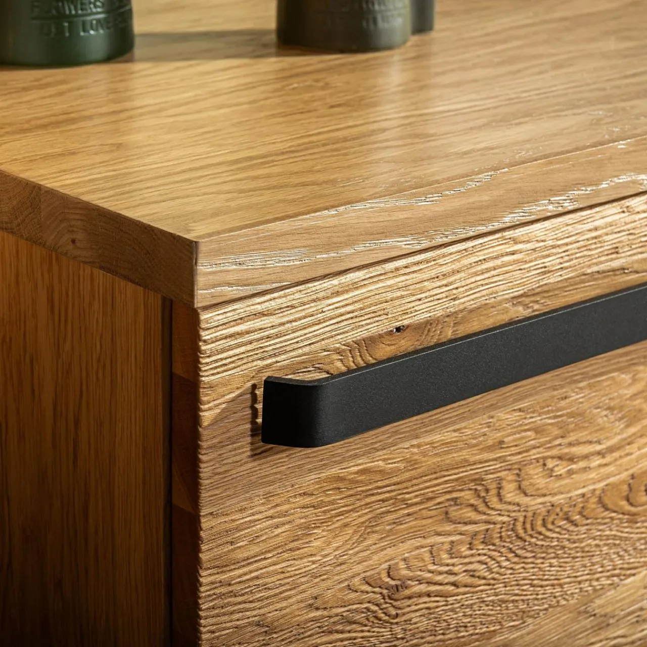 - Fronty z litego drewna dębowego oraz wykończenia mebli z naturalnej okleiny dębowej sprawiają, że meble posiadają niepowtarzalny rysunek drewna.