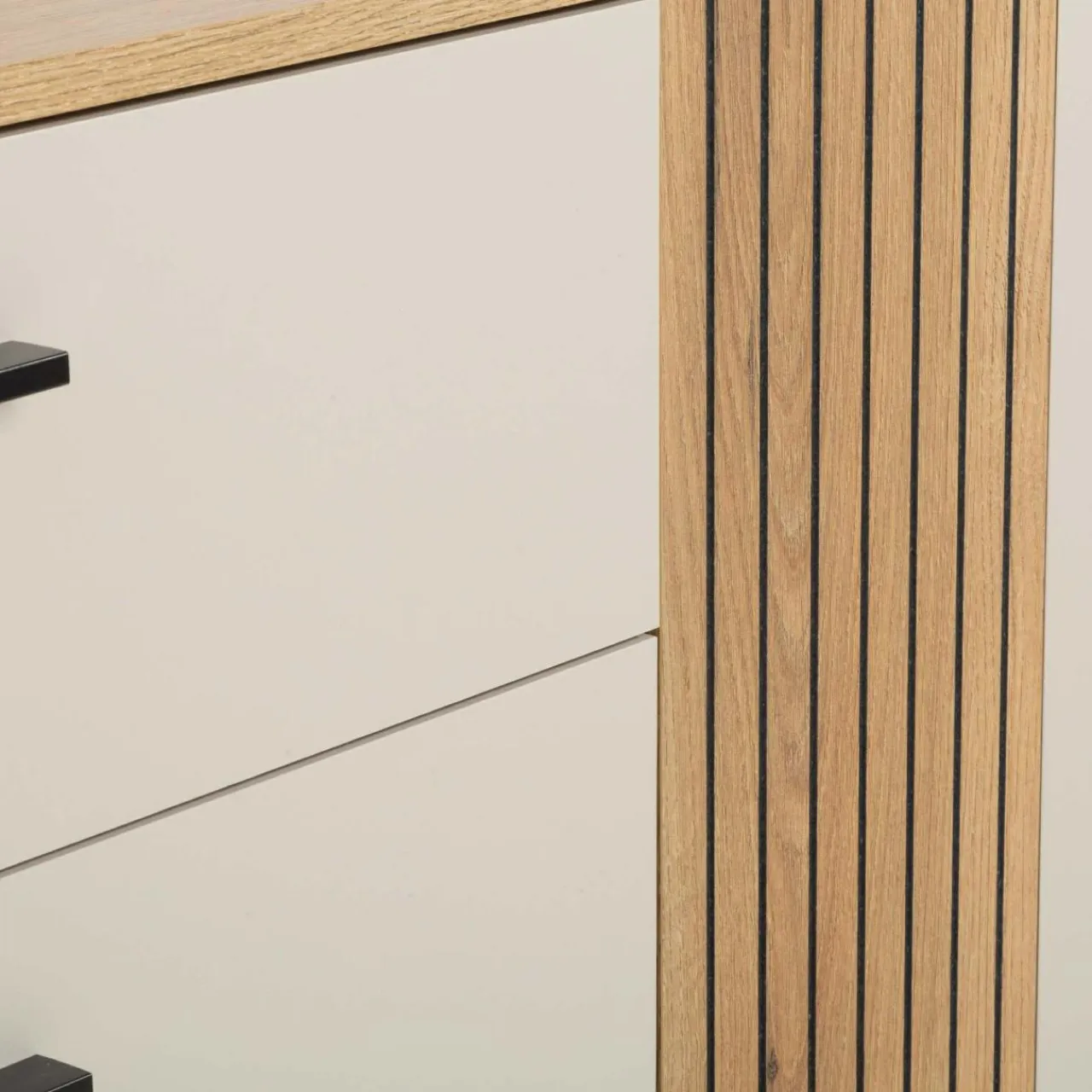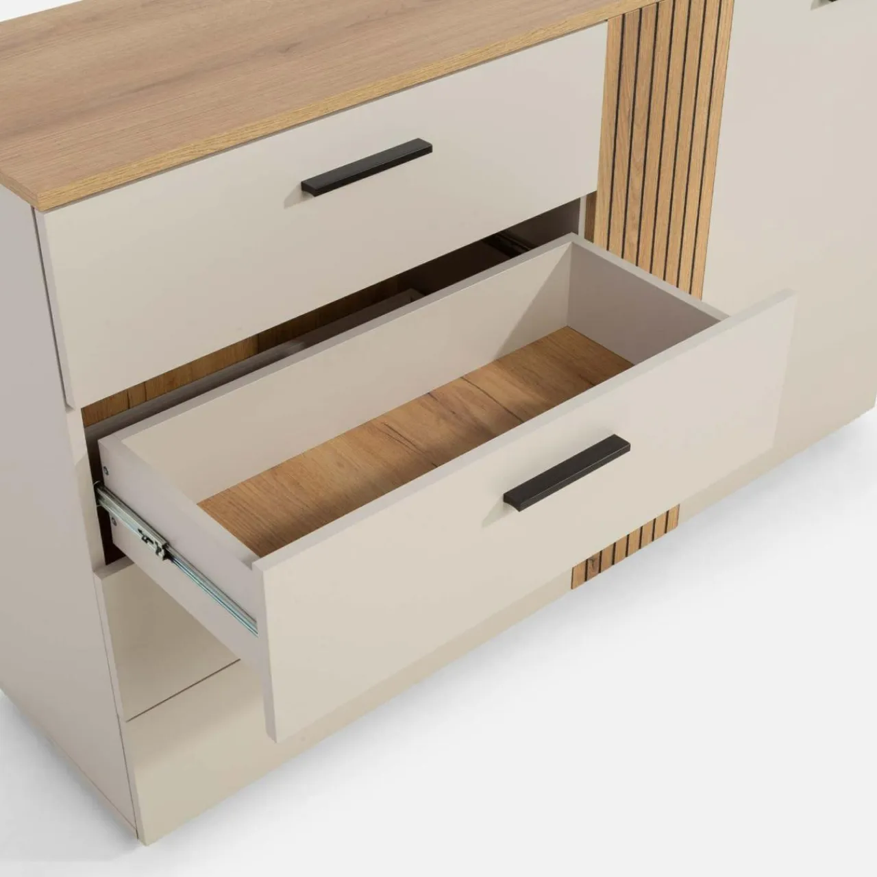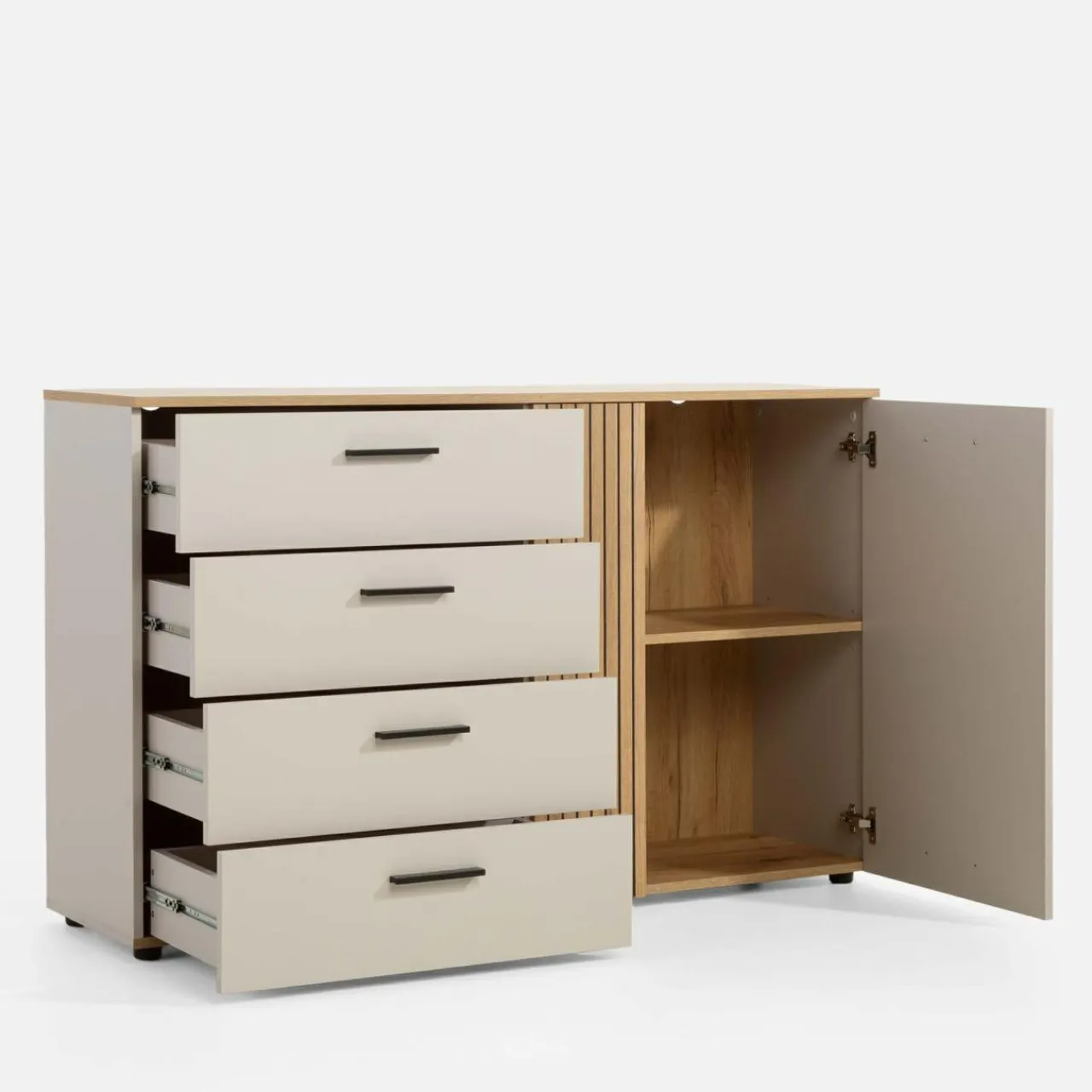 Zachowaj porządek w salonie z komodą FREZO. W szufladach oddzielisz tekstylia od dokumentów i drobnych przedmiotów. W bocznej szafce przechowasz resztę większych rzeczy.