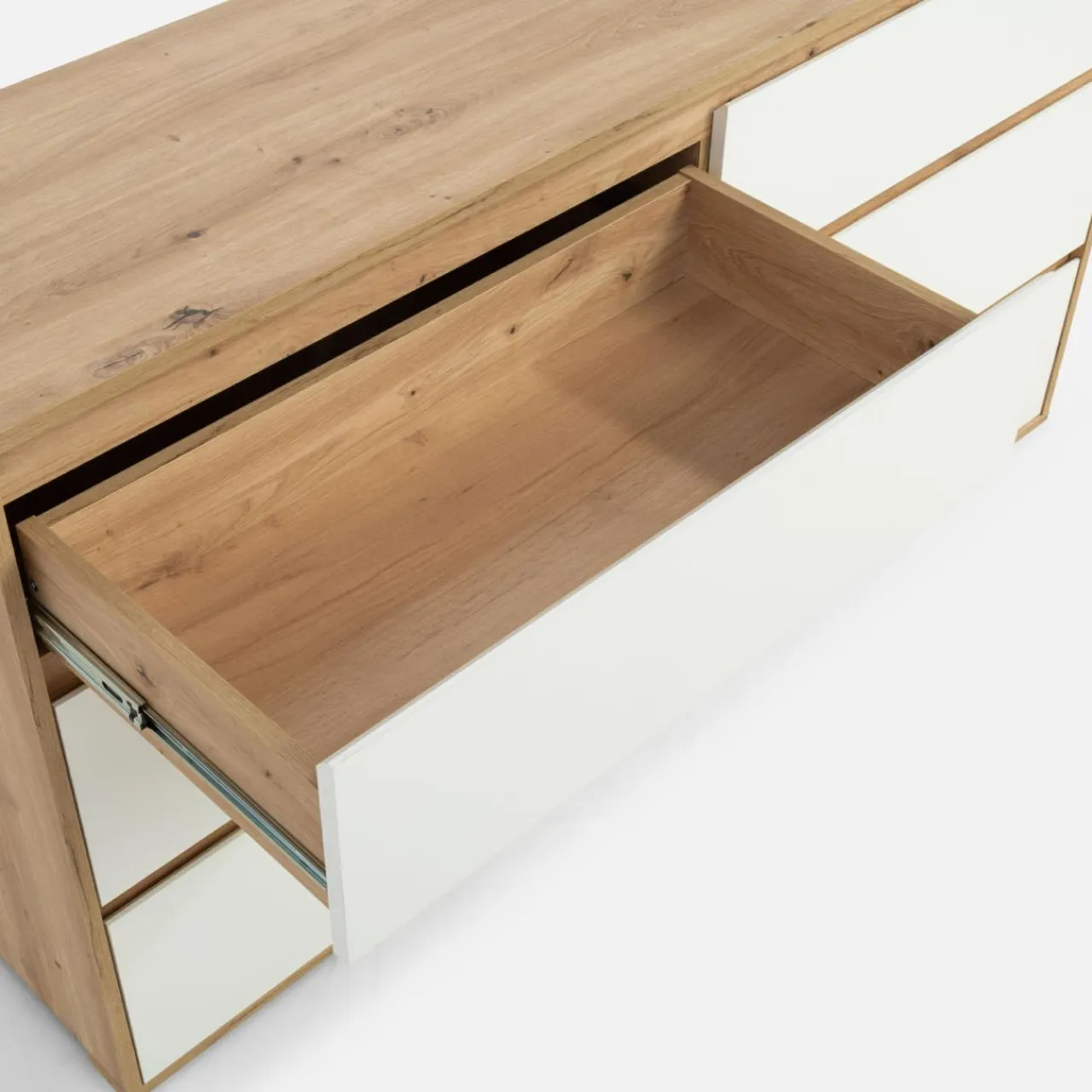 W komodzie FOGGIA pomieści się naprawdę sporo. W środku nie zabraknie miejsca również na większe przedmioty, takie jak patery lub dekoracje.