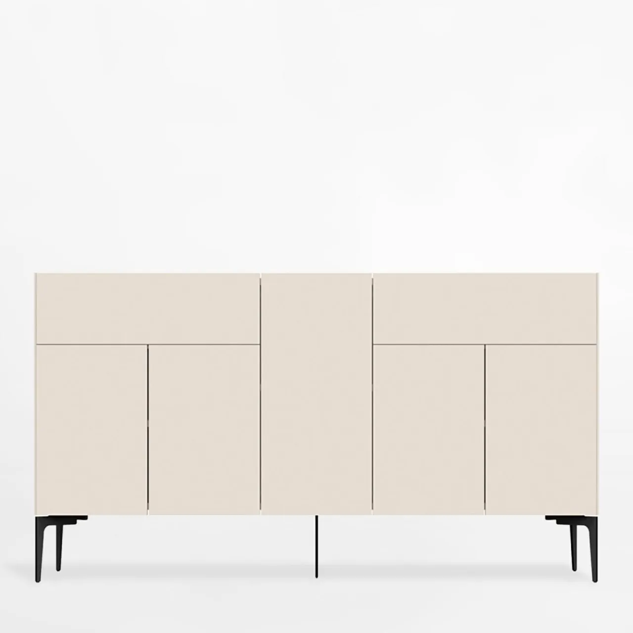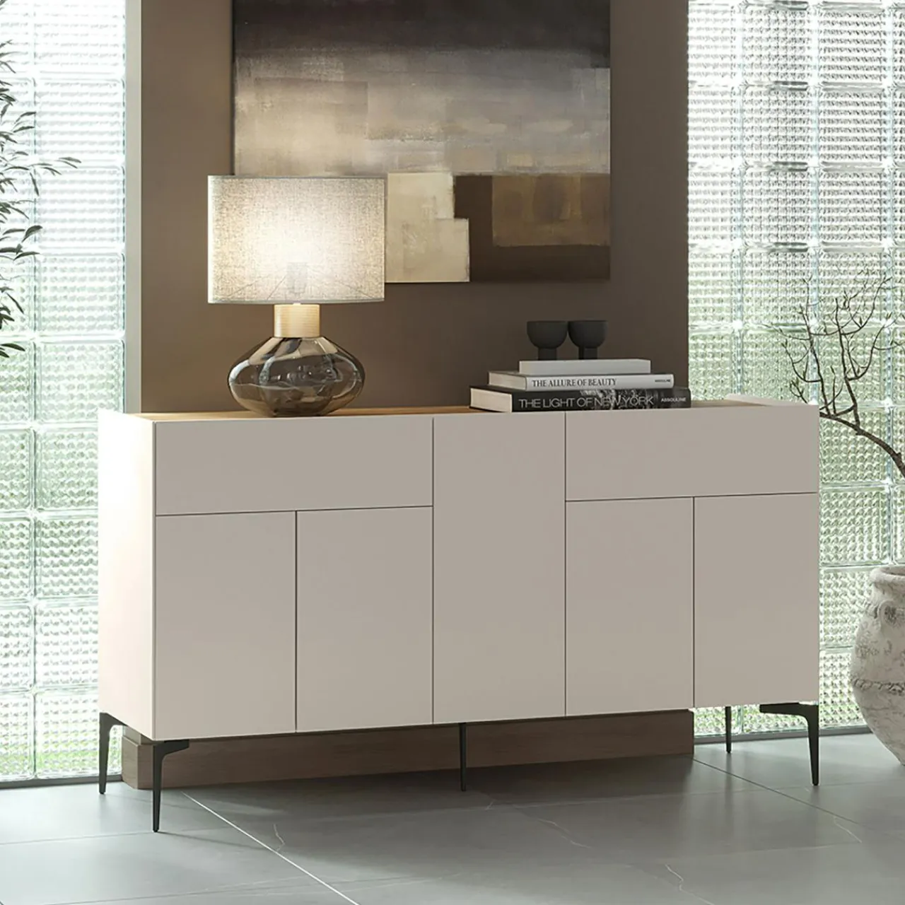 Komoda w kolorze kaszmir o nowoczesnym designie łączy estetykę z wygodą użytkowania. Odcień kaszmiru, zestawiony z ciepłym wnętrzem w kolorze dąb tobacco, tworzy elegancki i praktyczny mebel.
