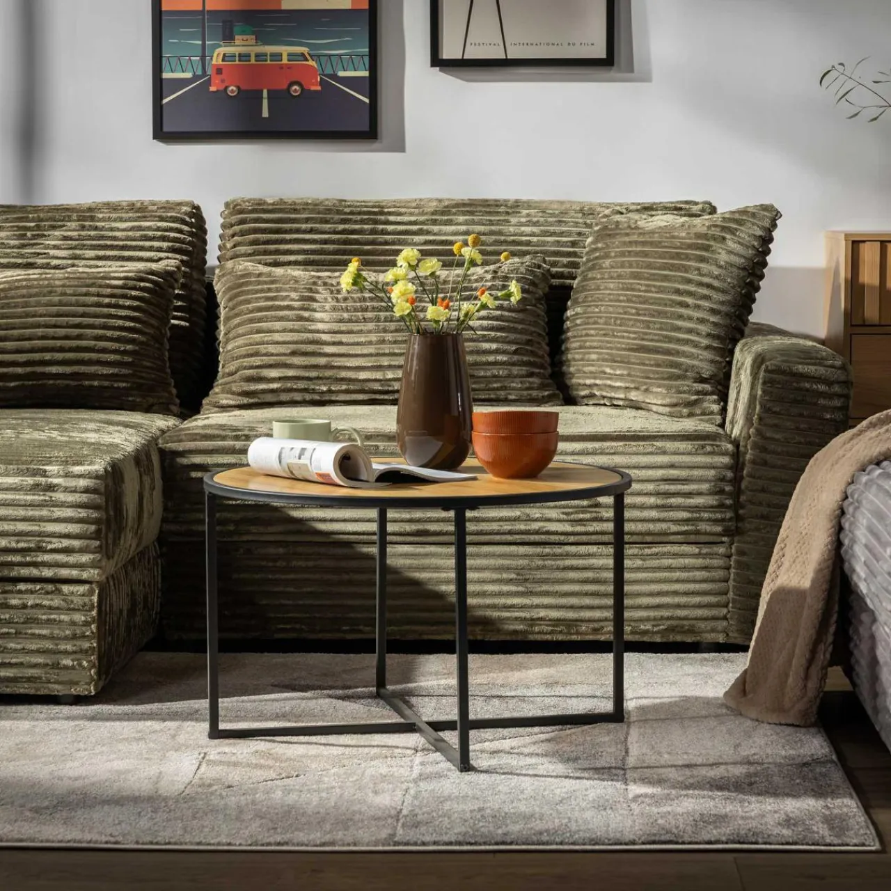 - Mniejszy stolik: wysokość – 38 cm, średnica blatu – 60 cm.