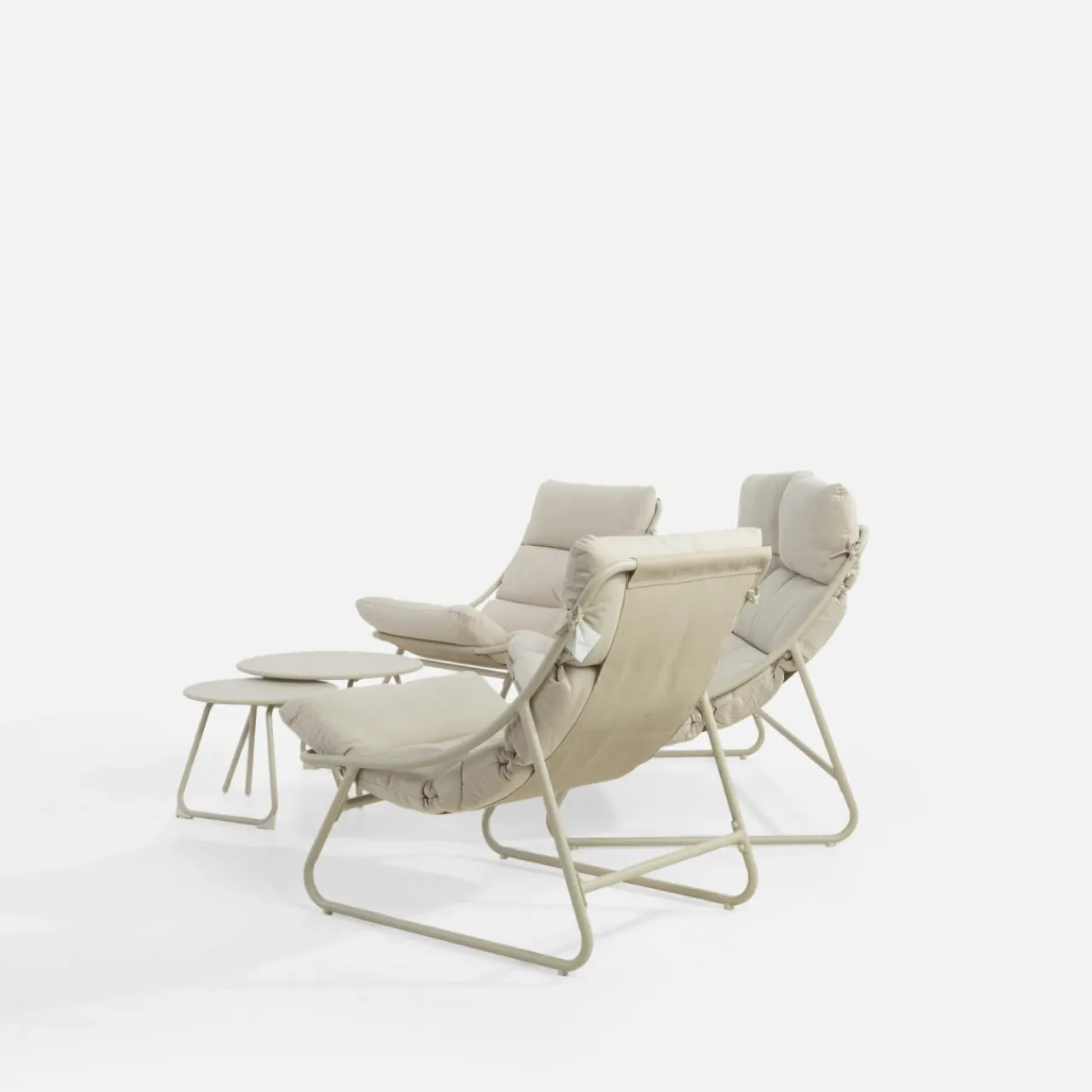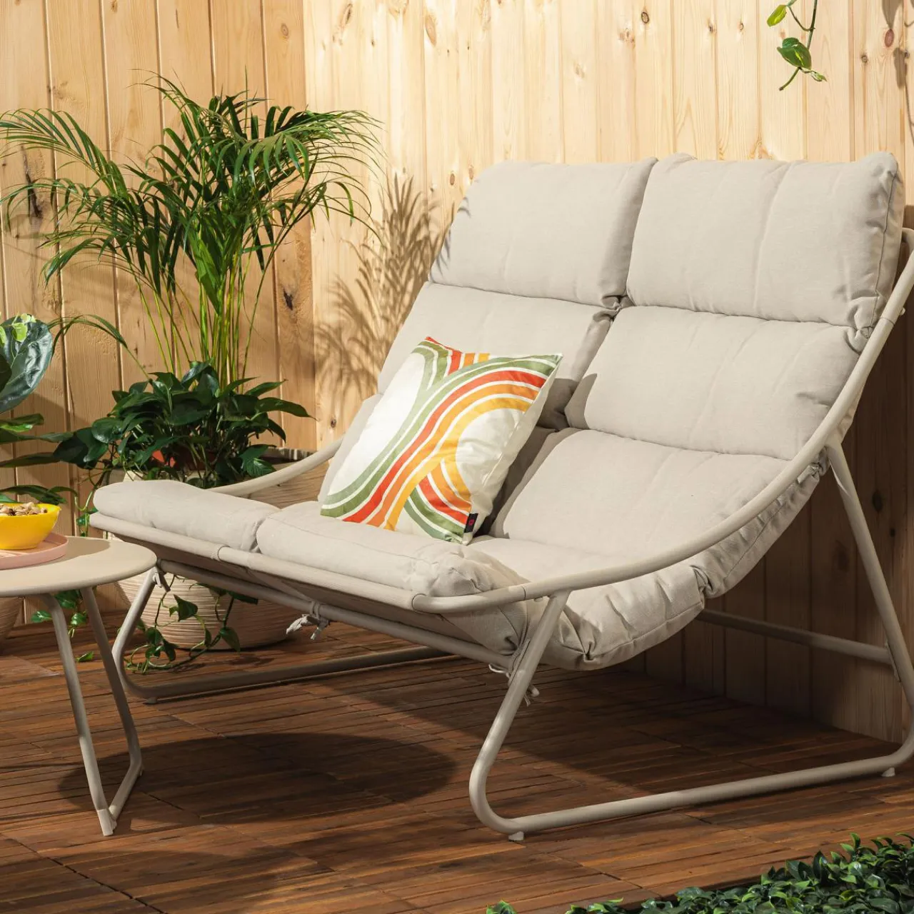 Zatop się w miękkich siedzeniach kompletu ogrodowego HUNDIGO. Budowa przypominająca hamak, dopełniona miękkimi poduszkami zachęca do spędzania wolnych chwil na świeżym powietrzu.