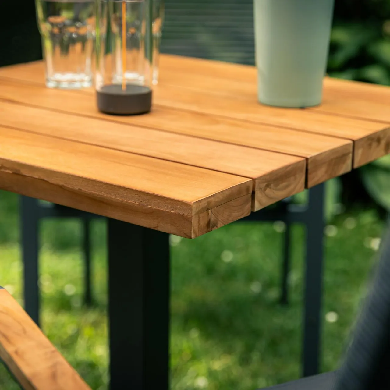 - Przy wysokim stoliku wygodnie zjesz posiłek na świeżym powietrzu. Stolik ma kwadratowy blat o szerokości – 60 cm, a wysokość – 72 cm.
