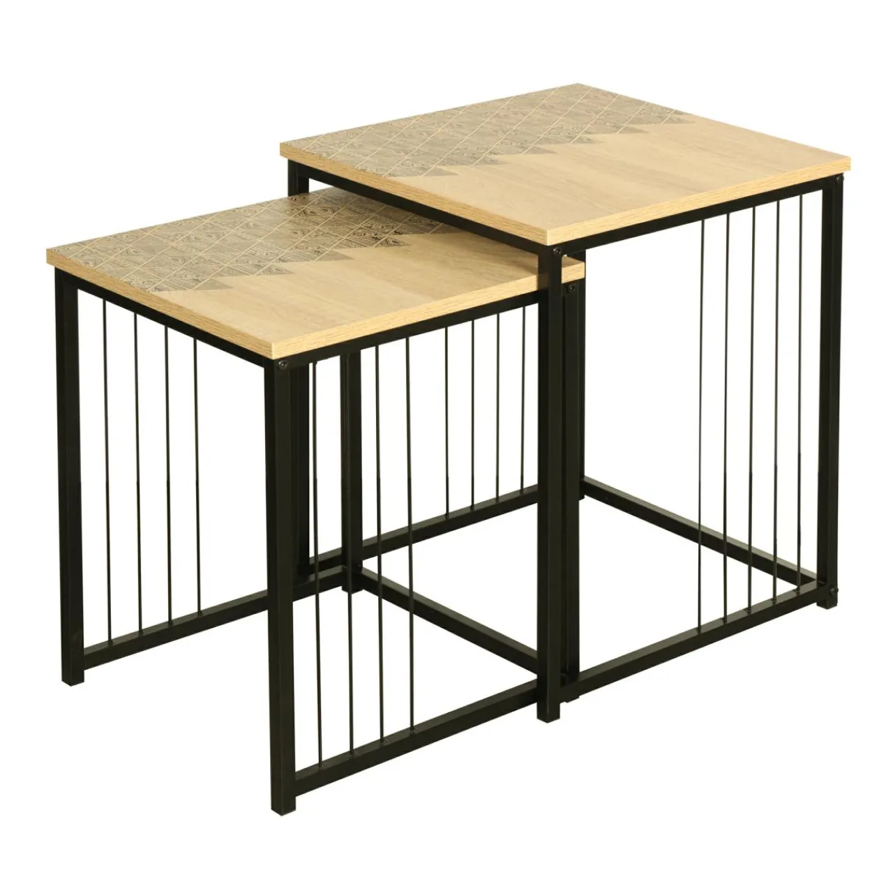 Geometryczne wzory na jasnym blacie łączą się z metalowym szkieletem w kolorze matowej czerni. Nogi dodatkowo ozdabiają cienkie drabinkowe pręty, dodając całej bryle lekkości. Połącz zestaw stolików z dywanem z frędzlami i wypoczynkiem, żeby cieszyć się przytulnym salonem.
