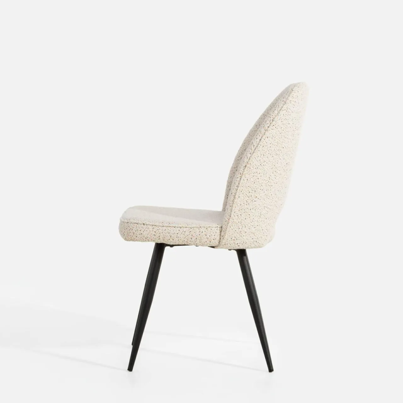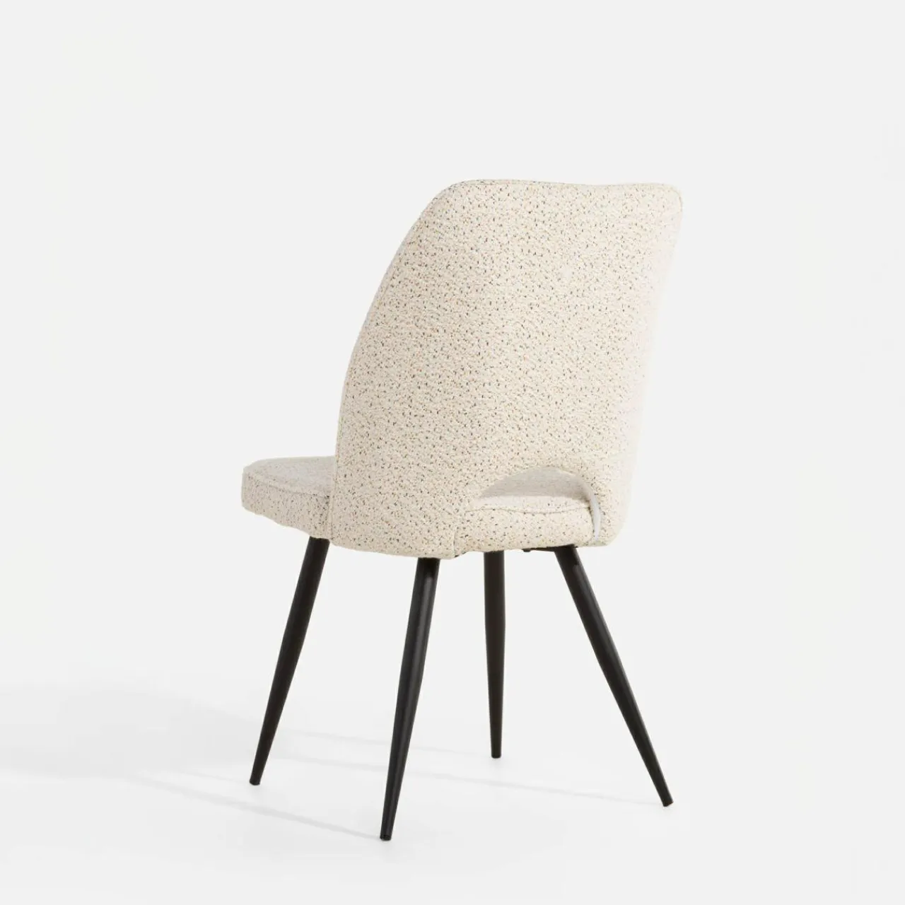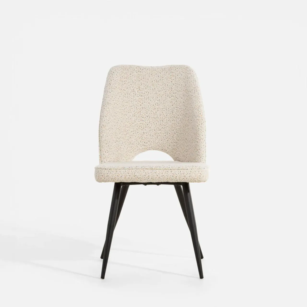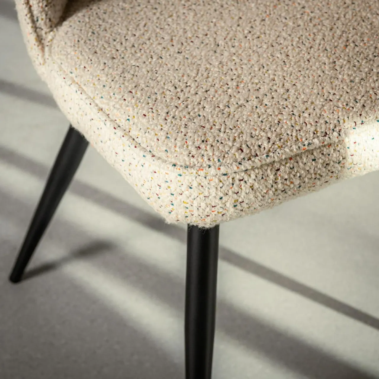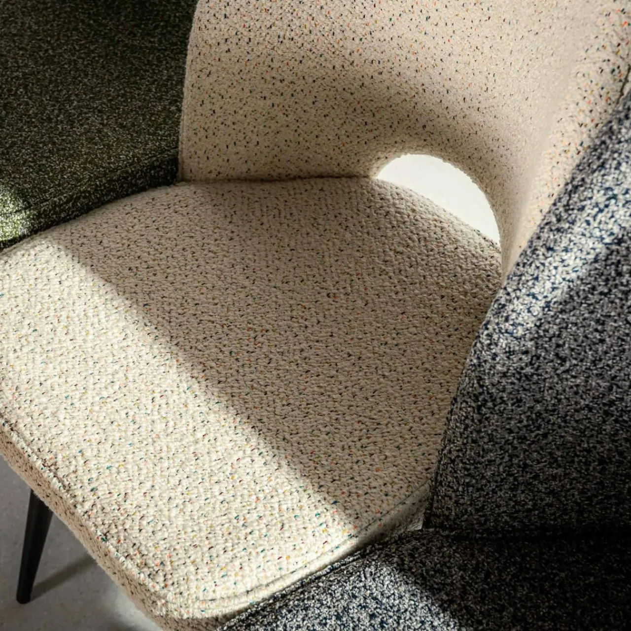 - Melanżowa, biała tkanina z kolorowymi nitkami sprawia, że krzesło wyróżnia się na tle pomieszczenia. Będzie wesołym elementem w stonowanej jadalni — przypomina śmietankowe lody udekorowane tęczową posypką!