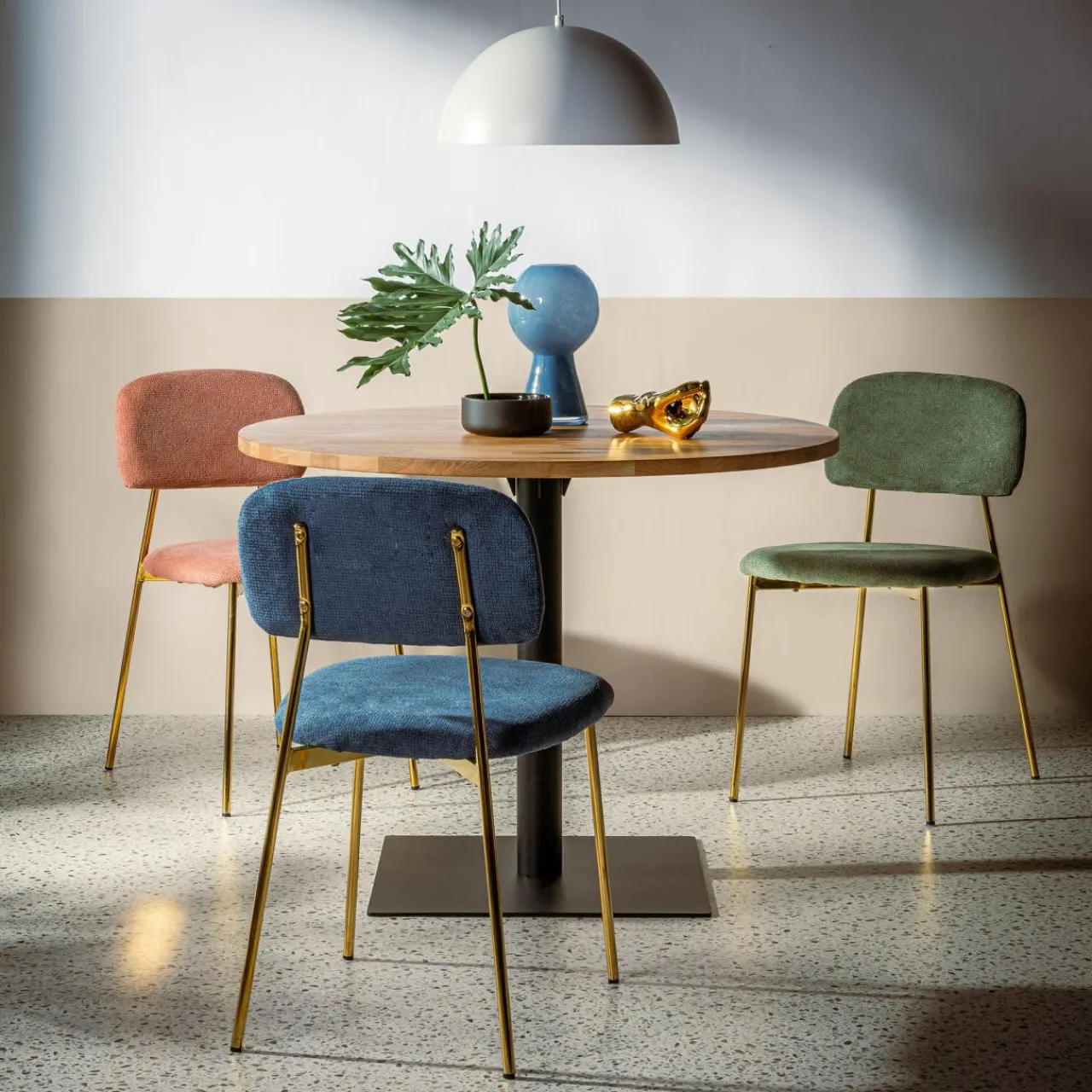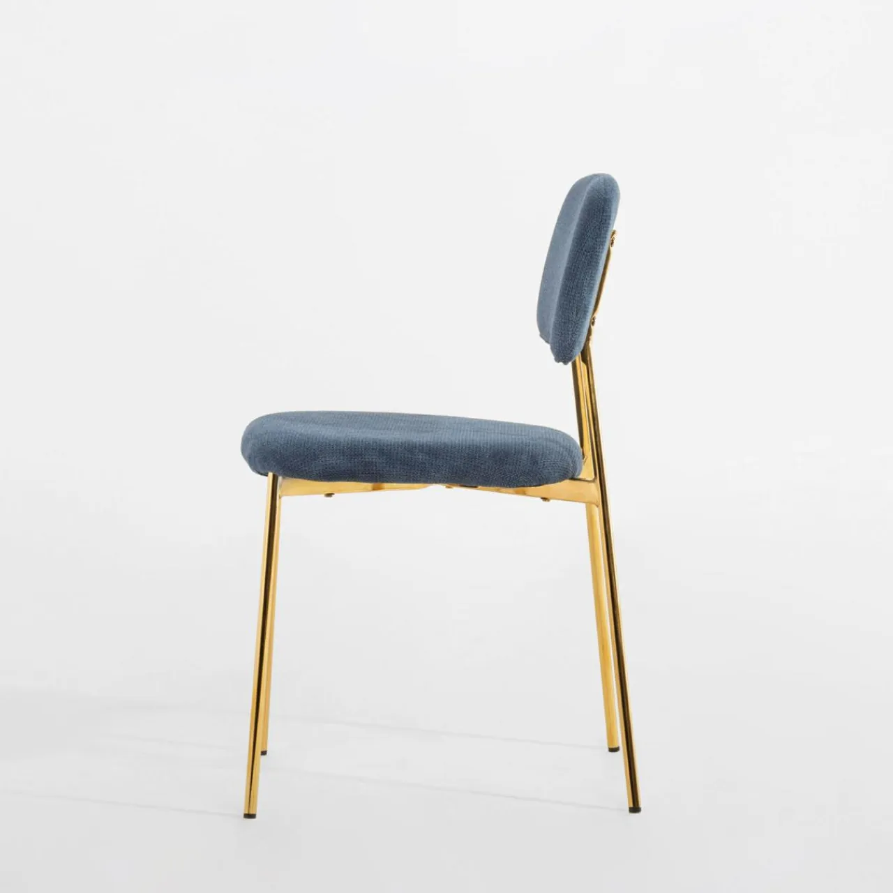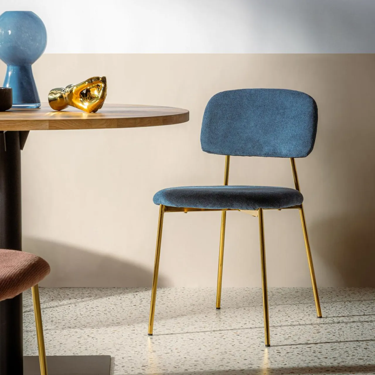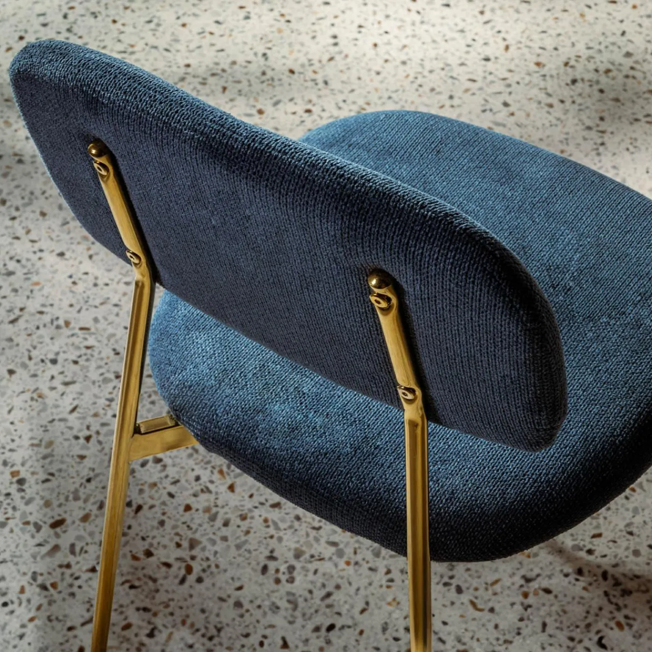 Gustujesz w eleganckich wnętrzach? Krzesło ERMENIO urzeknie Cię stylowym połączeniem granatu i złota – pięknie wkomponują się w jadalnię urządzoną w stylu glamour lub art deco.