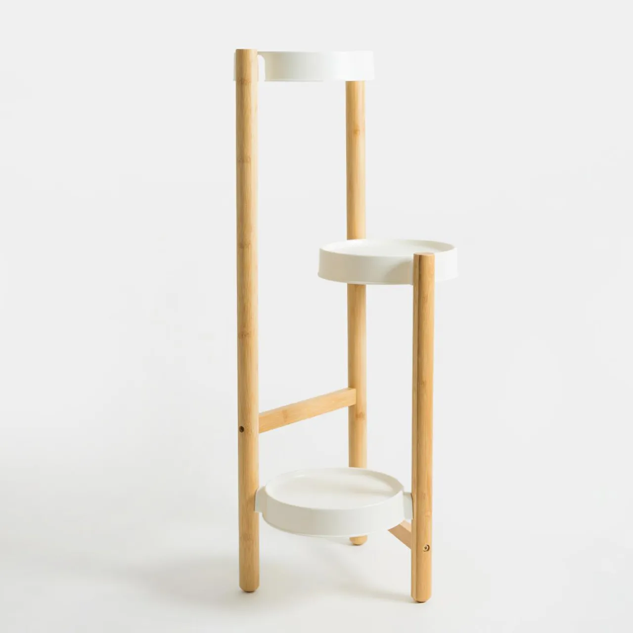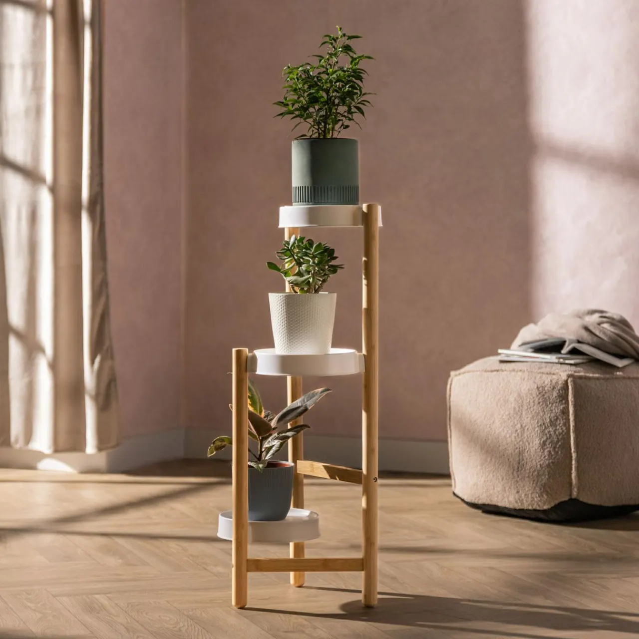 Kwietnik o wysokości 87 cm z 3 podestami na kwiaty pomoże Ci zaaranżować przestrzeń tak, jak tego potrzebujesz – naturalne drewno podkreśli wystrój urban jungle lub styl skandynawski.