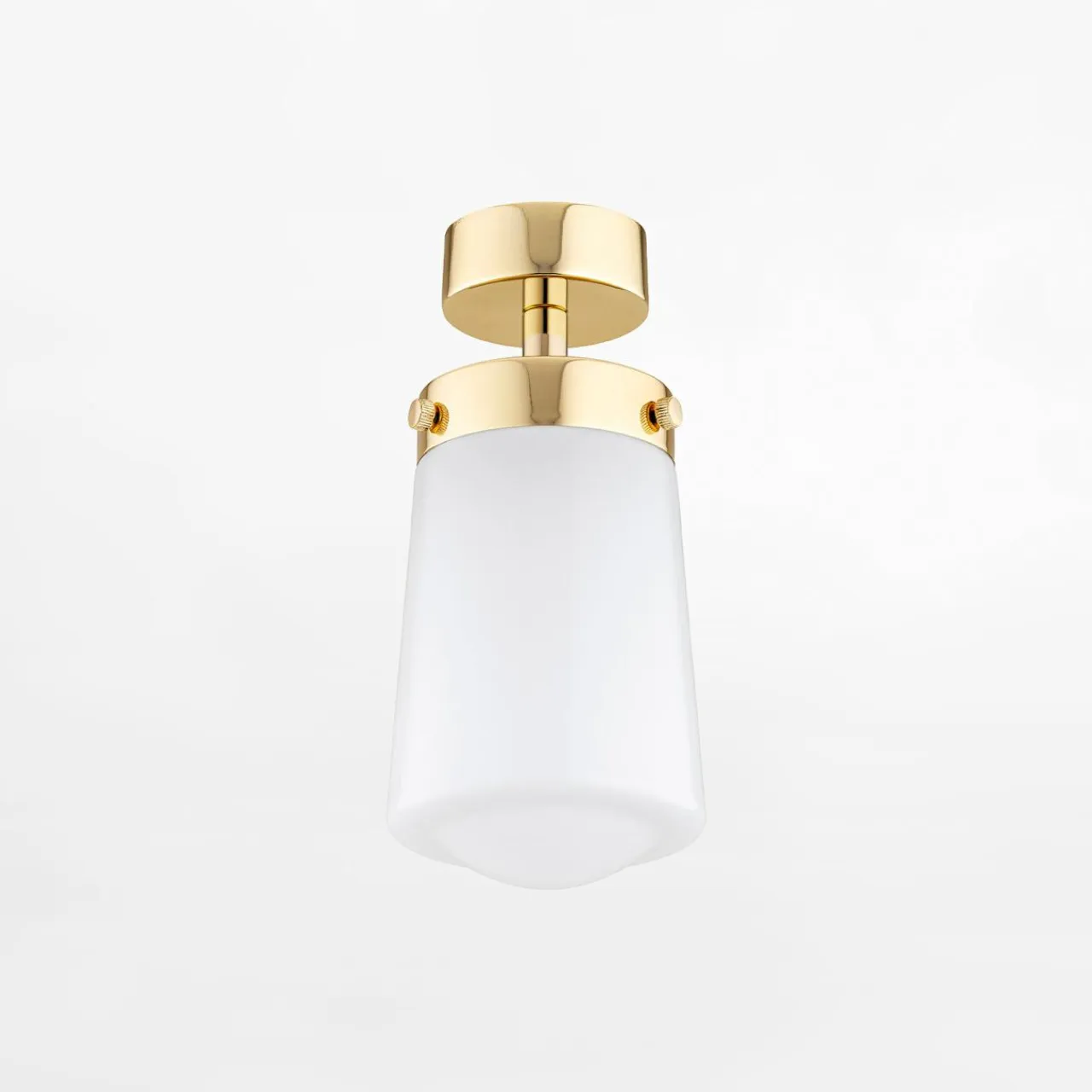Posiada błyszczące wykończenie w kolorze mosiądzu oraz biały klosz z miejscem na żarówkę typu E27.