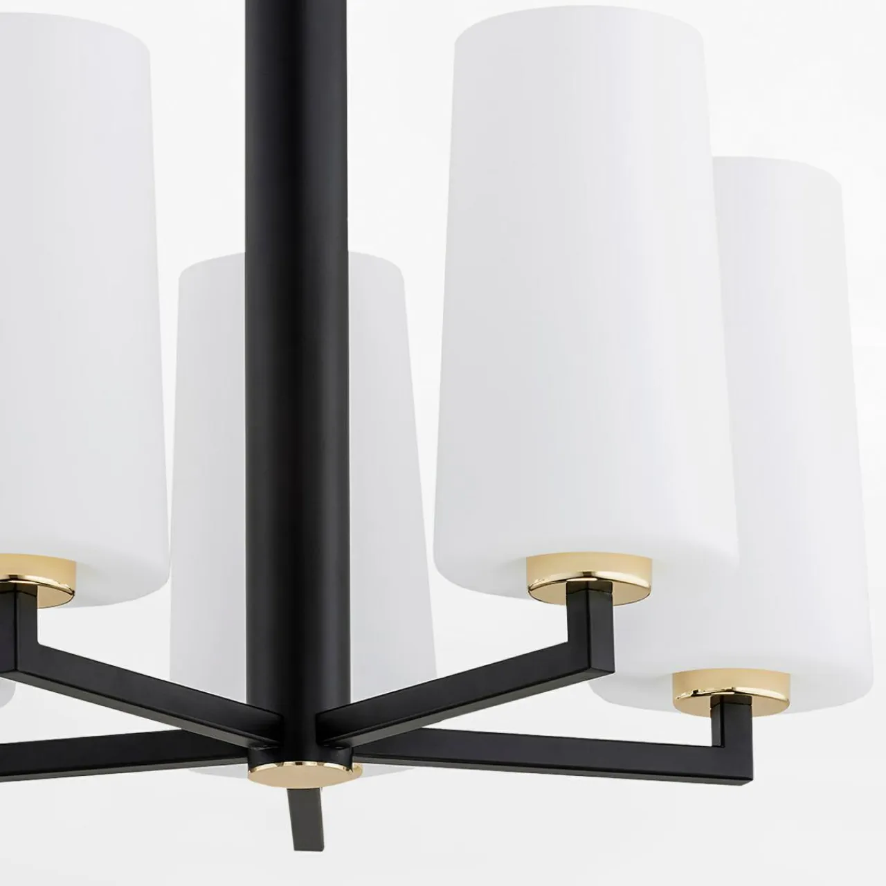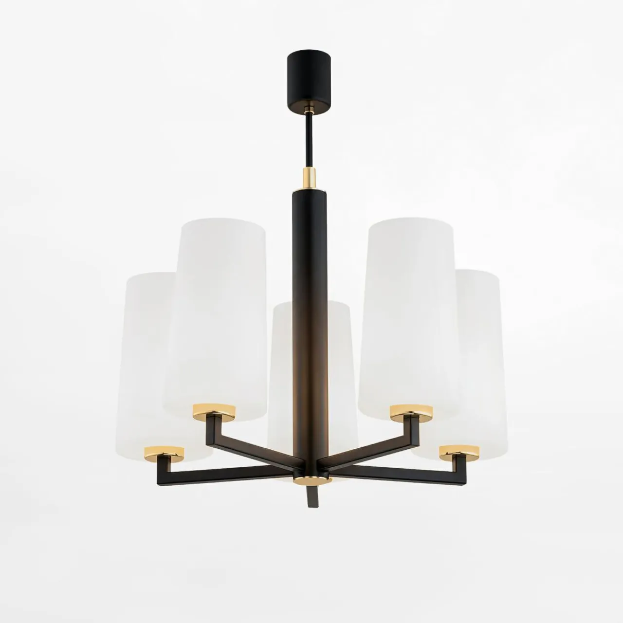 Posiada stelaż i ramiona w czarnym, matowym kolorze z 5 kloszami z mlecznego szkła. Pomostem miedzy nimi jest złoty element dekoracyjny, umieszczony przy oprawach żarówek.