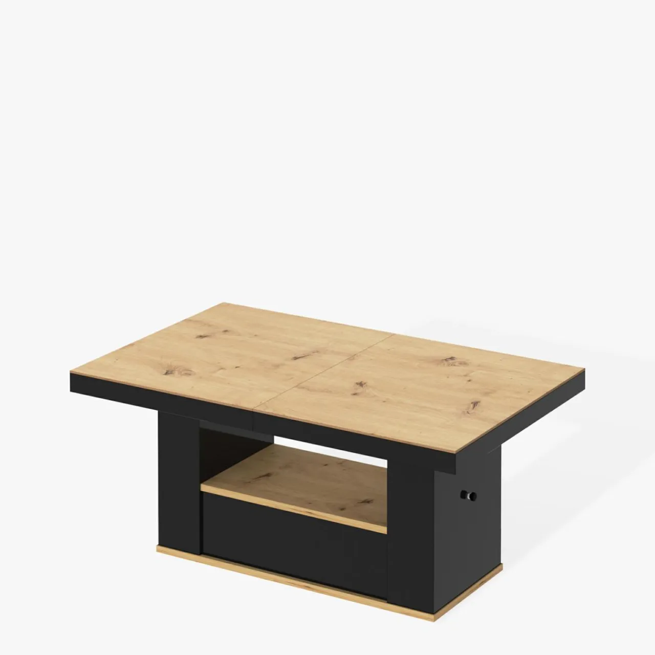 Blat i podstawa w laminacie dąb artisan nadają wnętrzu ciepły charakter, a postawa i front szuflady w czarnym połysku dodają elegancji.