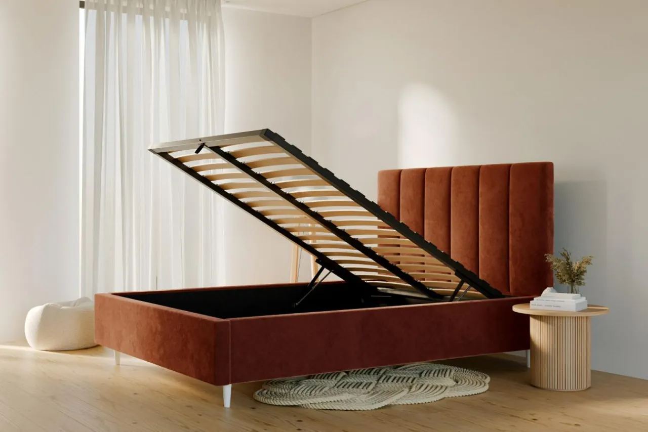 - Pojemnik pod stelażem da Ci przestrzeń, w której przechowasz pościel i inne domowe tekstylia. Dostęp do niego ułatwi Ci podnośnik gazowy.