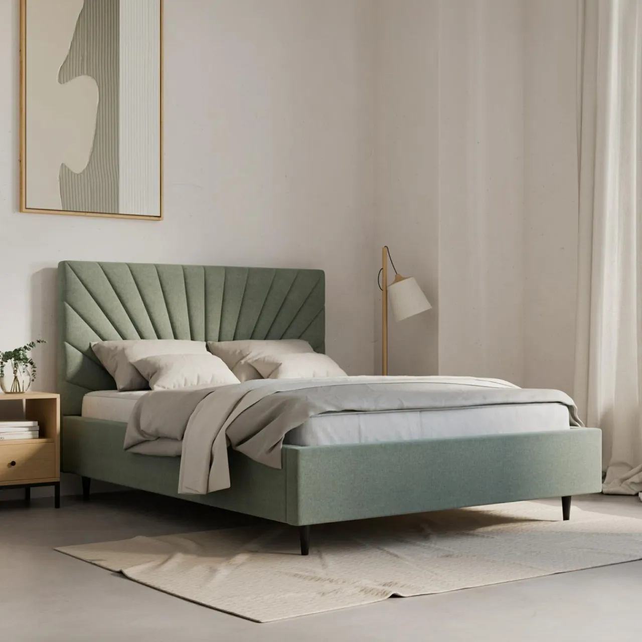 - Łóżko jest wyposażone w tapicerowaną ramę oraz stelaż, które stworzą komfortową powierzchnię spania dla 2 osób.