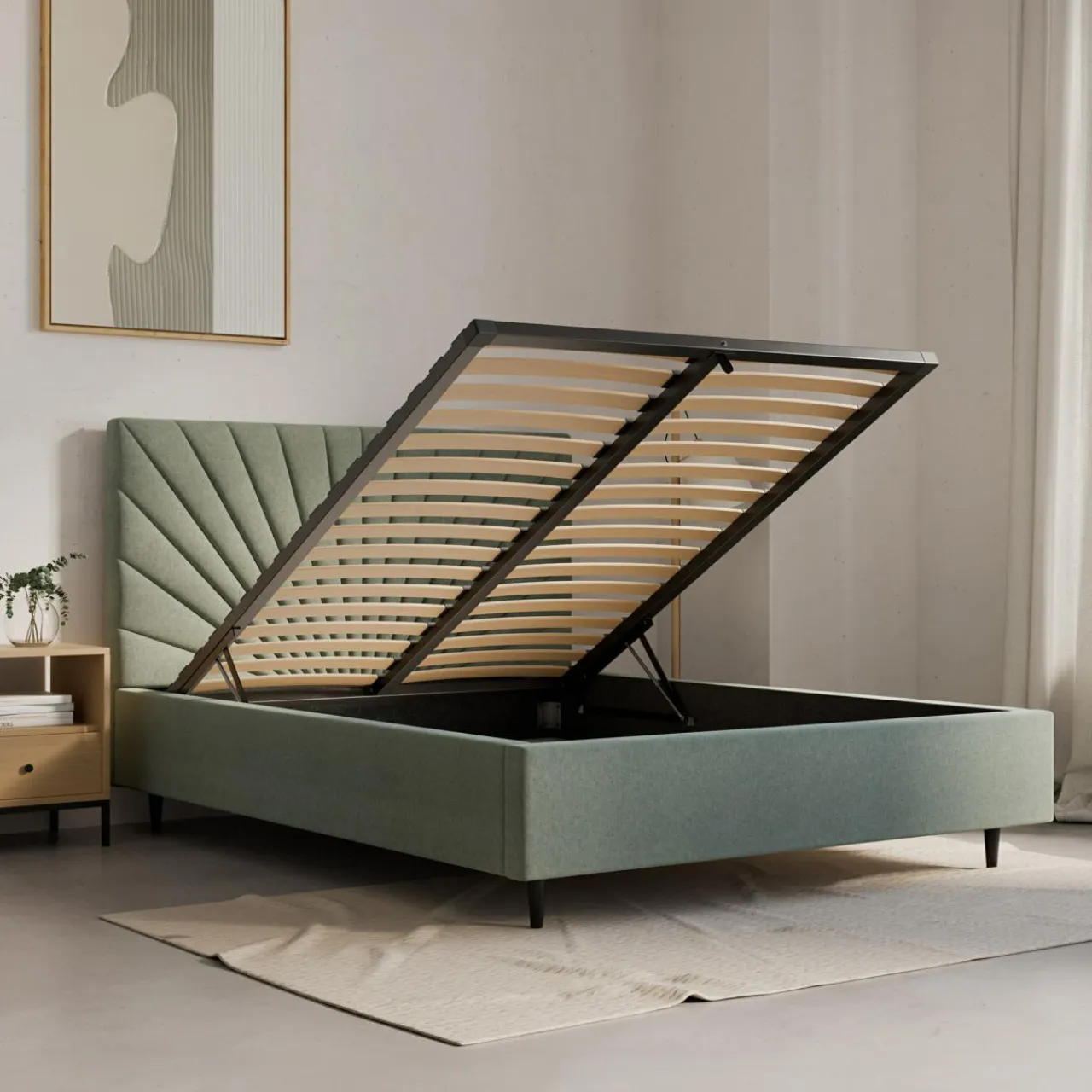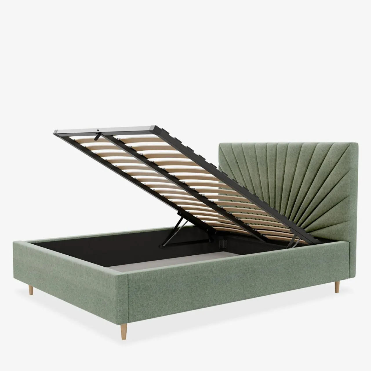 - Pojemnik pod stelażem da Ci przestrzeń, w której przechowasz pościel i inne domowe tekstylia. Dostęp do niego ułatwi Ci podnośnik gazowy.