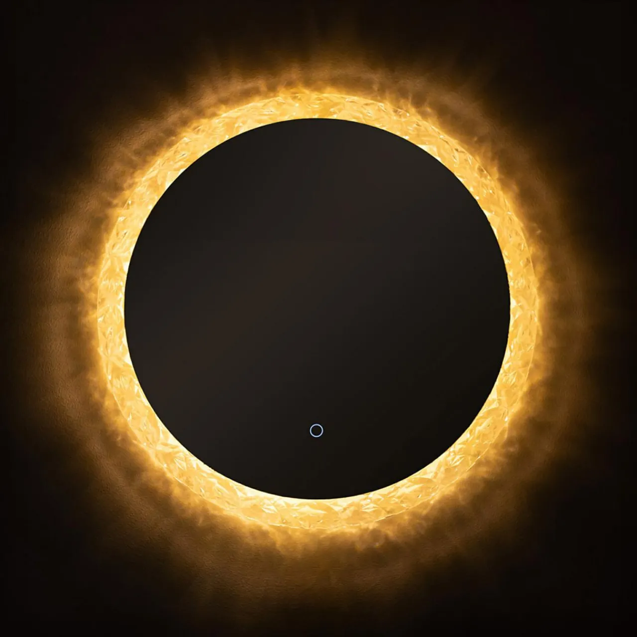 - Oświetlenie LED ukryte w ozdobionej akrylowymi kryształkami ramie otacza okrągłą taflę lustra. Dzięki temu jego powierzchnia jest zawsze dobrze doświetlona.