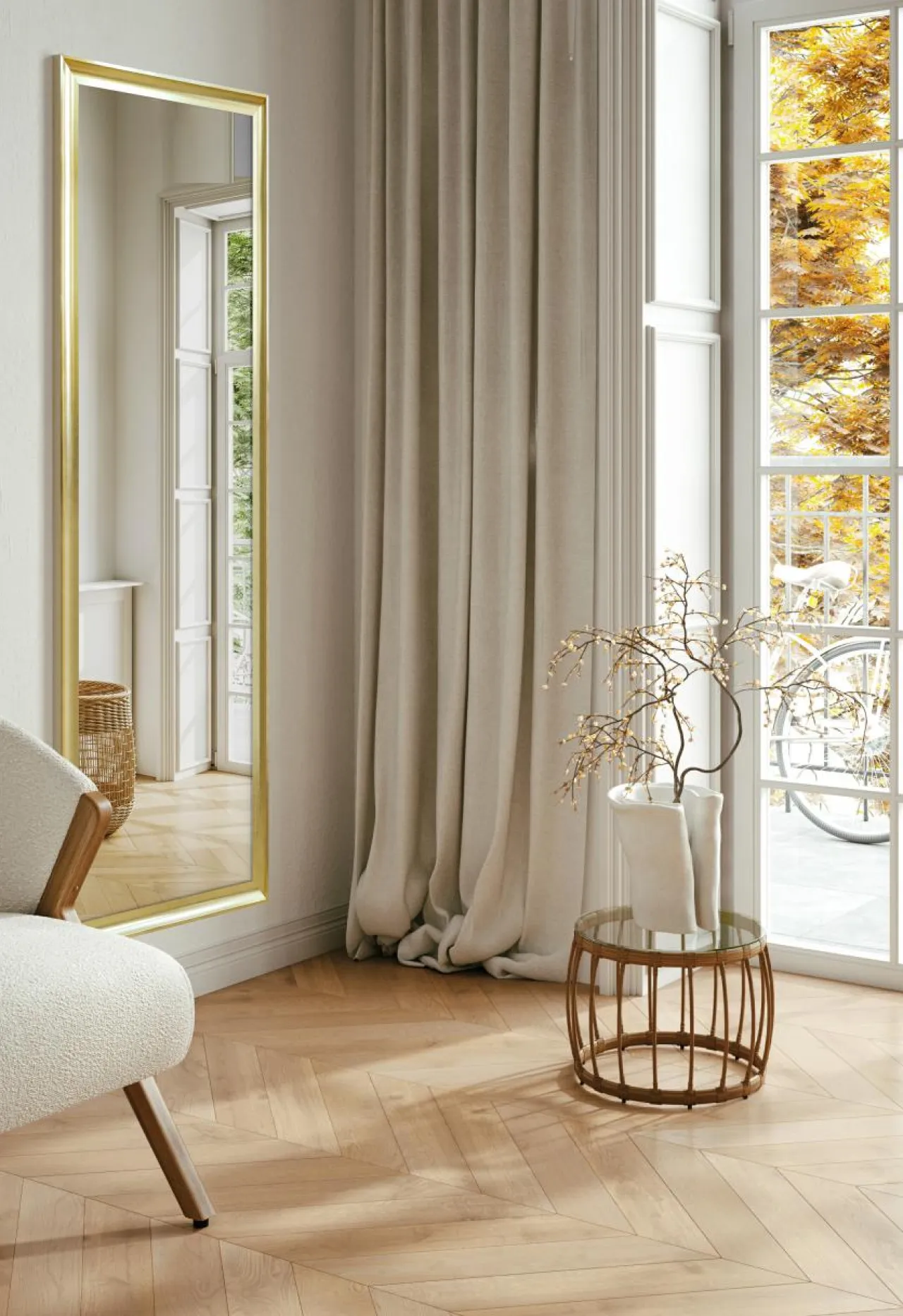 Złota rama wygląda elegancko i doskonale pasuje do ciemnych ścian oraz jasnych mebli, nadając pomieszczeniu głębi i charakteru. Idealnie podkreśla elegancję wnętrza. Dzięki dużym rozmiarom tafli, lustro optycznie powiększa przestrzeń, co jest szczególnie korzystne w mniejszych pomieszczeniach.