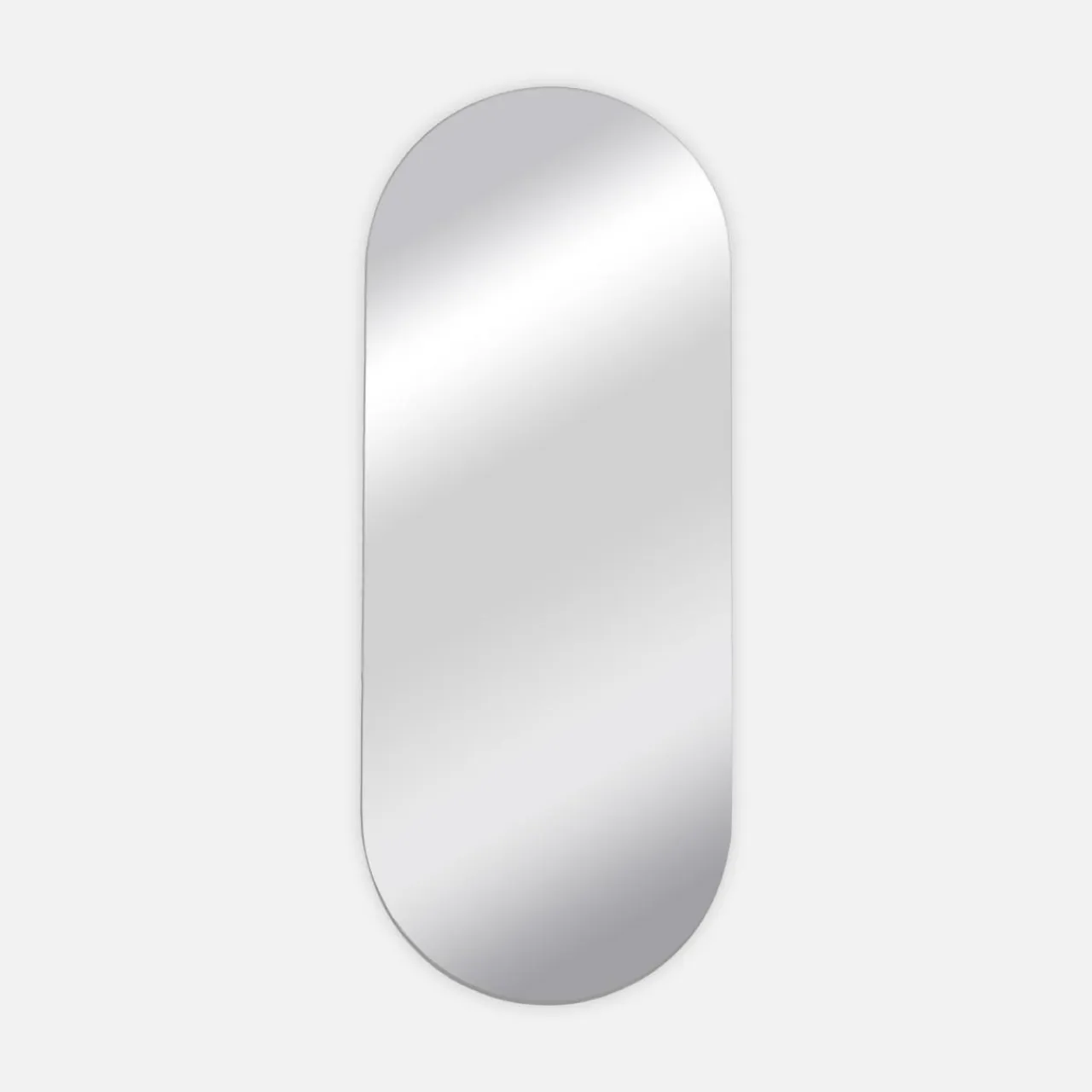- Owalne lustro MILA nie posiada widocznej ramy. Wymiary tafli to 100×40 cm, przy grubości 3 mm.