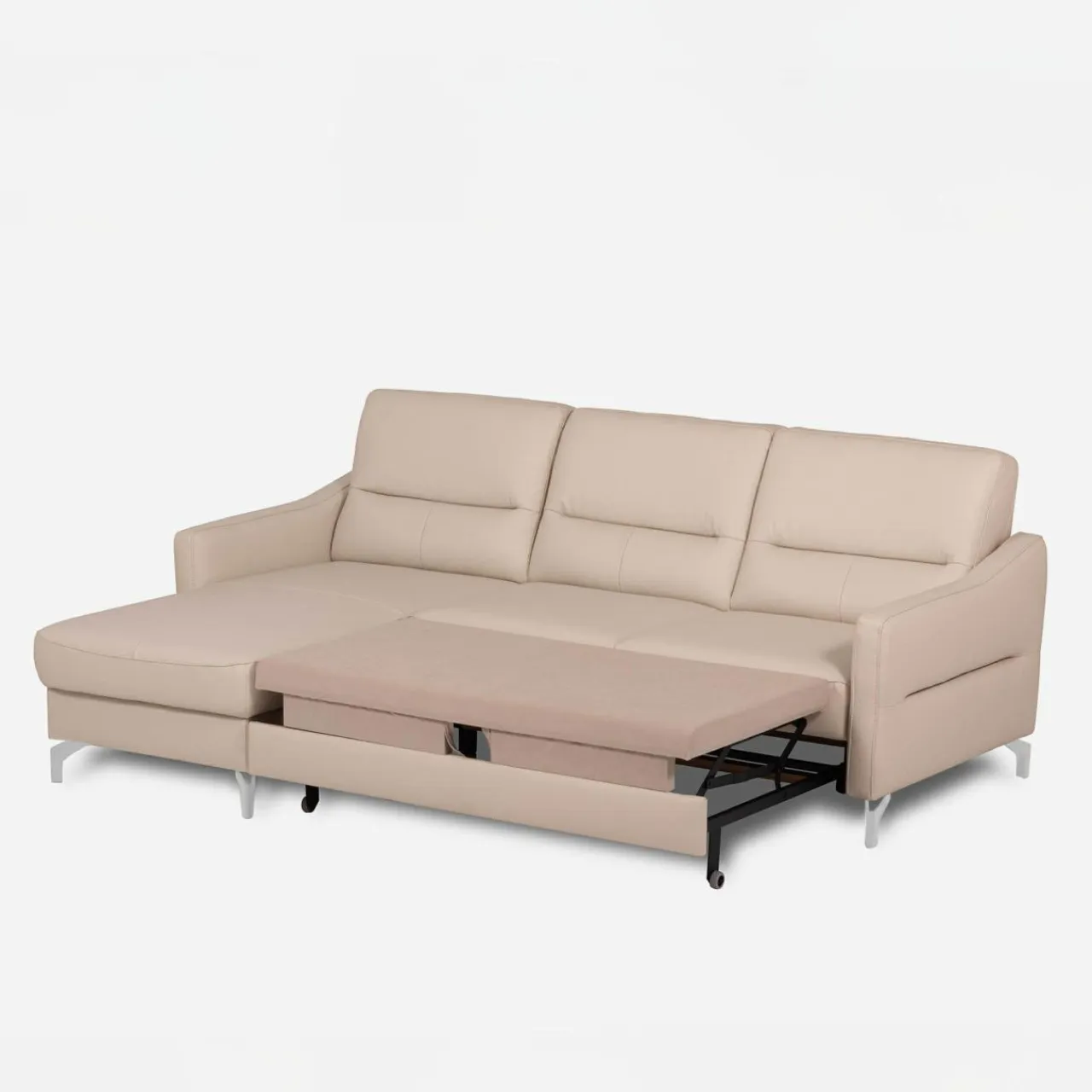 Stelaż pod siedziskiem wysuwamy i podnosimy za pomocą uchwytu. Mebel nie wymaga odsuwania od ściany. Idealny do okazjonalnego spania.
