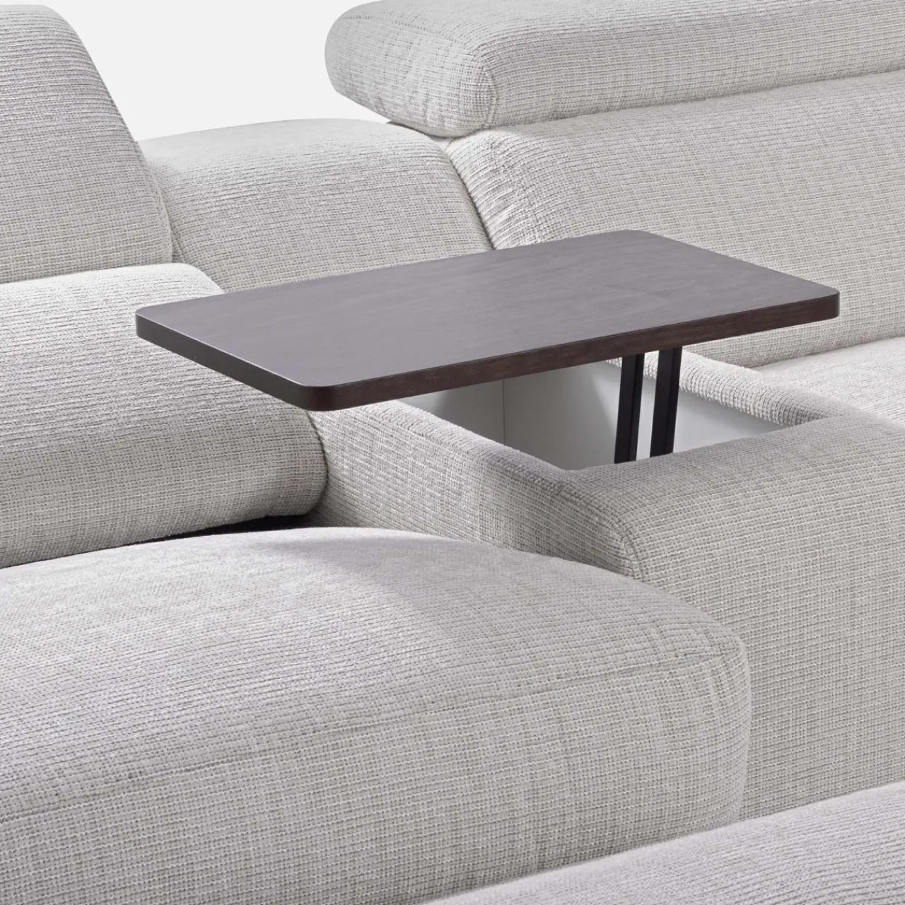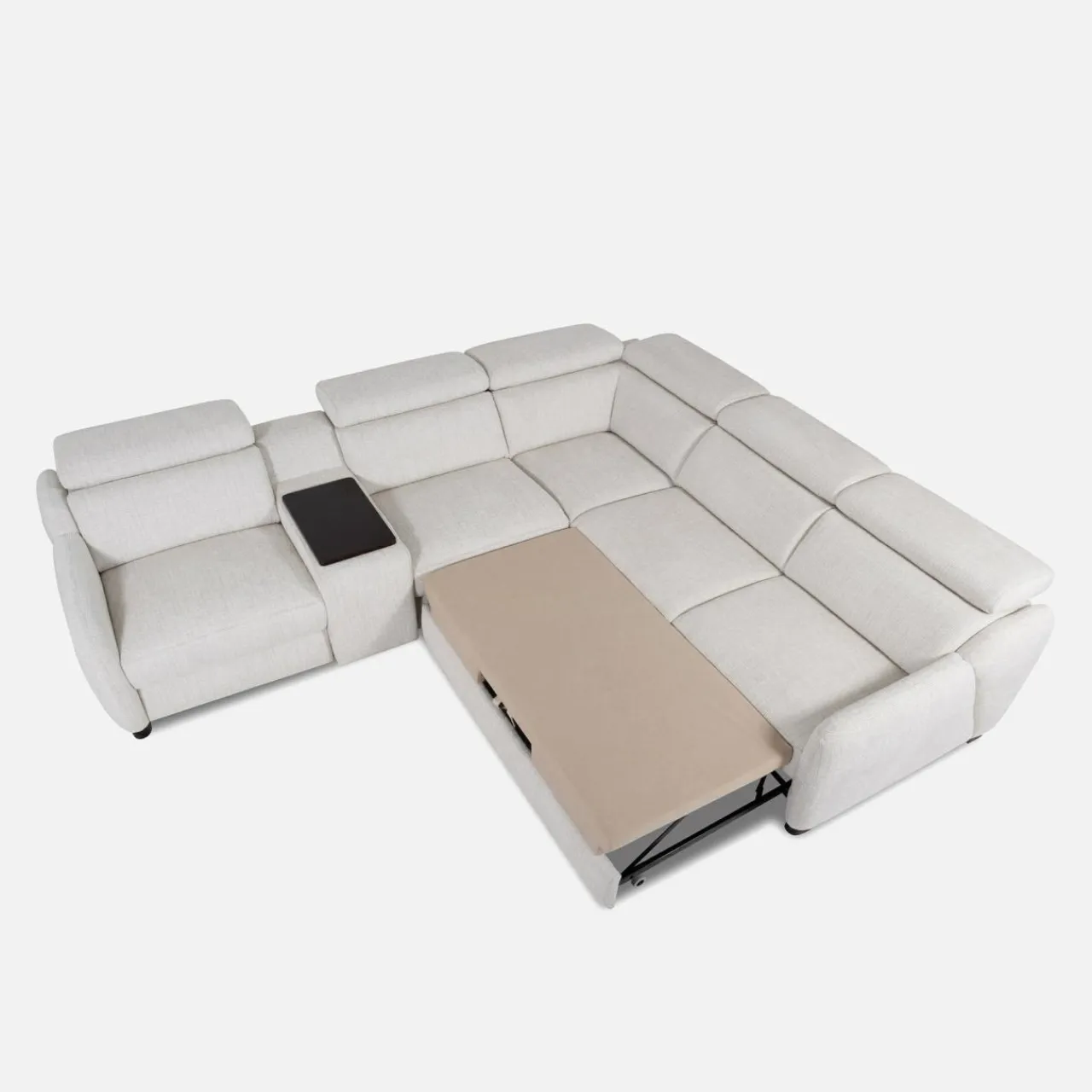 - Narożnik wyposażony jest w fotel z elektryczną funkcją relaks, która pozwala rozsiąść się wygodnie w pozycji półleżącej — idealnej do oglądania filmów, czytania książek lub po prostu relaksu.