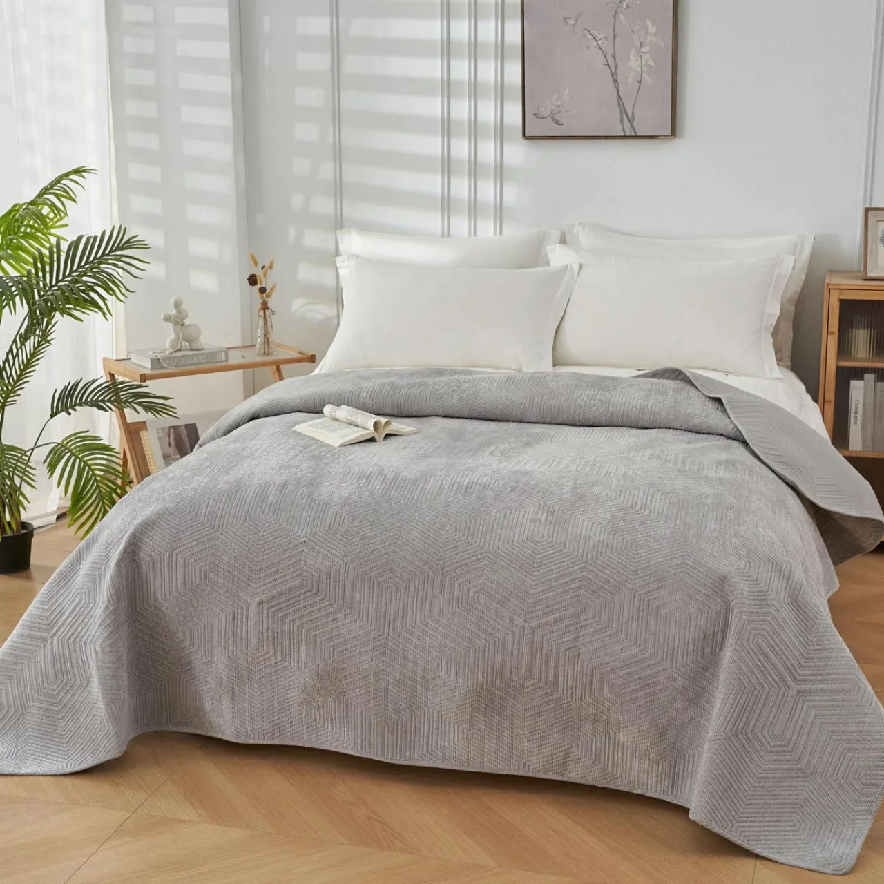Szara narzuta na łóżko z kolekcji HYPNOSE o wymiarach 220×240 cm z dekoracyjną fakturą w pasy to wybór dla tych, którzy szukają czegoś uniwersalnego i stylowego.