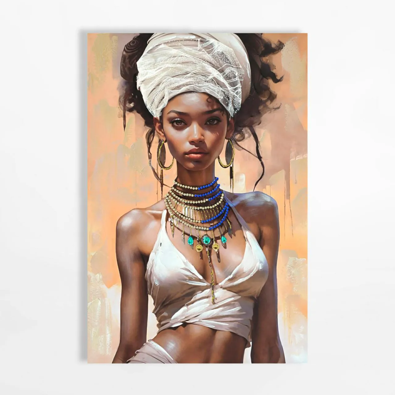Obraz na płótnie przedstawiający Afrykankę w białym stroju to wyjątkowa dekoracja, która wprowadzi do wnętrza odrobinę egzotyki i elegancji.