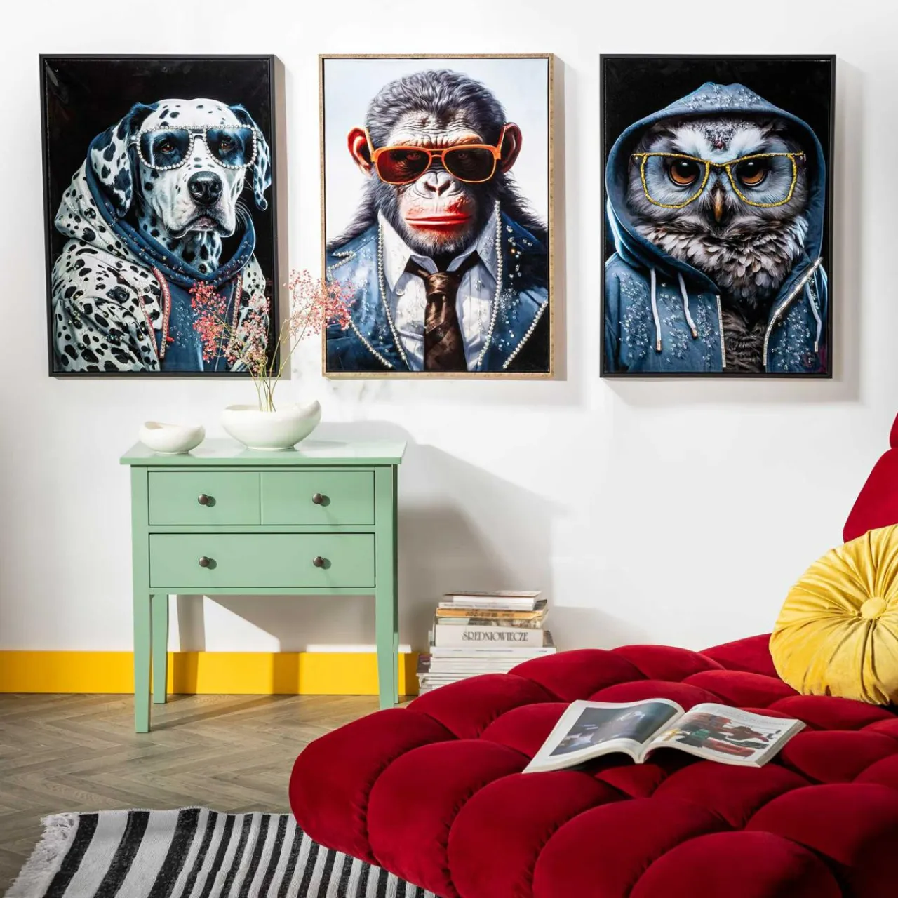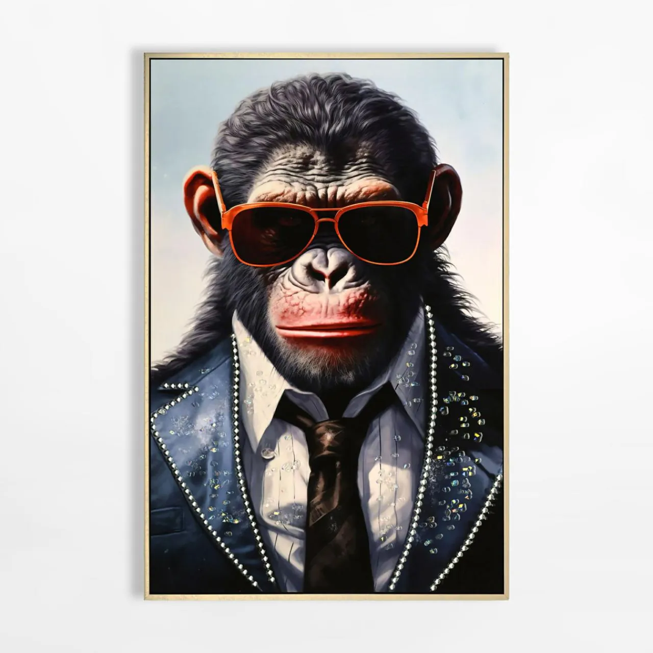 Obraz na płótnie z grafiką małpy w garniturze ma oryginalny wygląd – ozdobne akrylowe elementy sprawiają, że obraz lekko połyskuje.